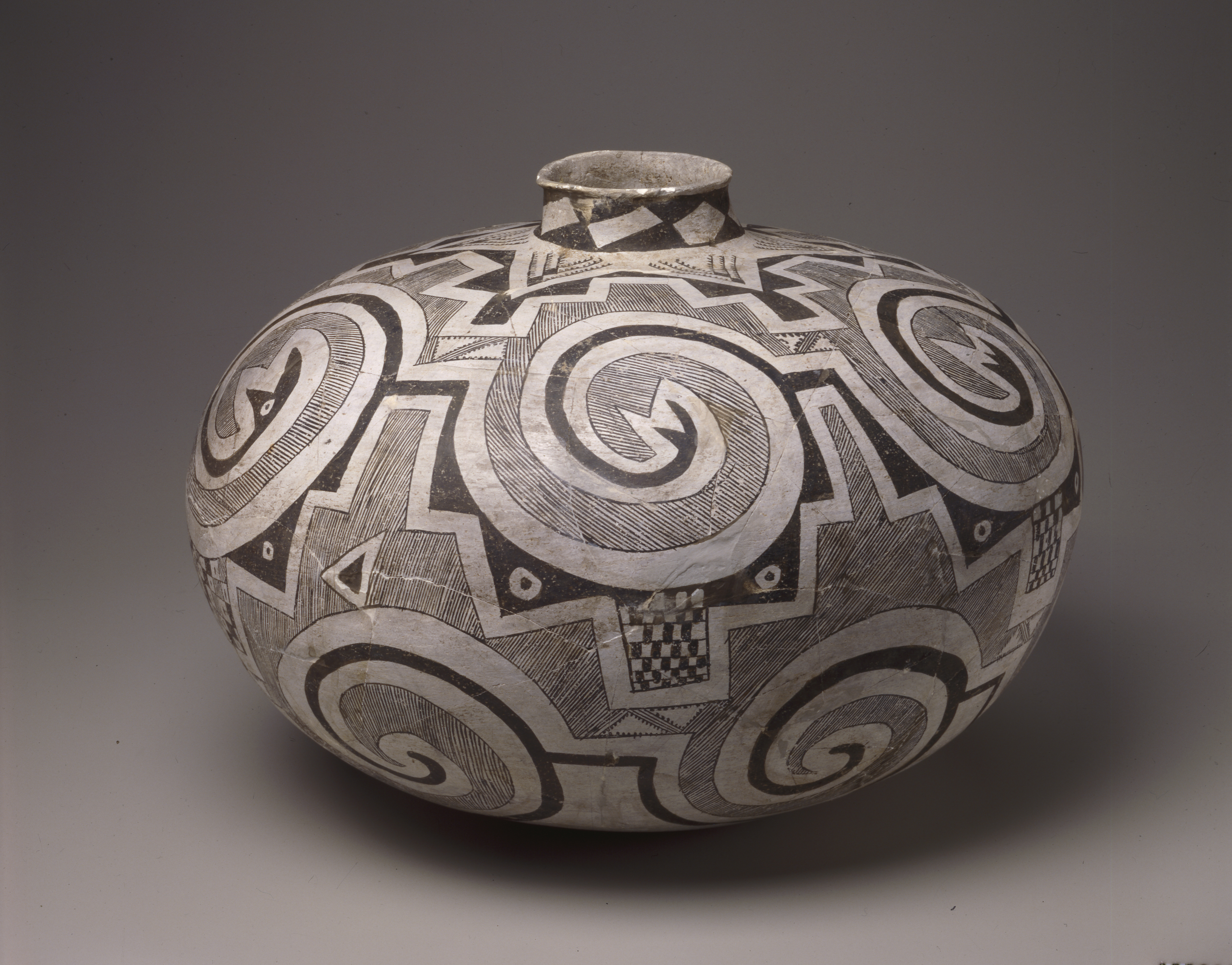 The repeating spiral and stepped motifs seen here relate to a particular ceramic style produced in northern Arizona and New Mexico called Tularosa black-on-white. The complex composition of the black designs complements the large size of the vessel form. With its rounded body and narrow neck, this vessel is referred to as an "olla."