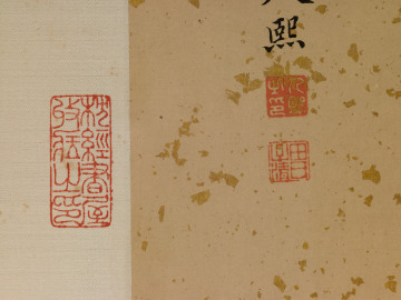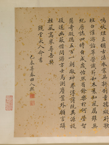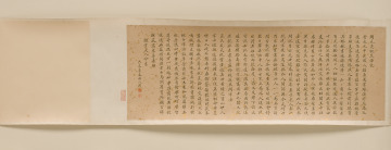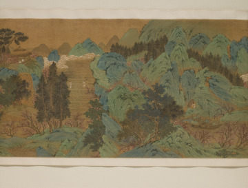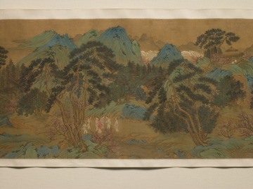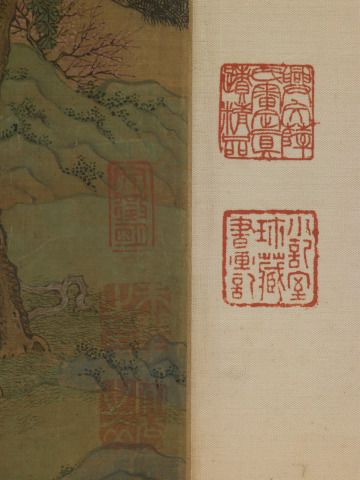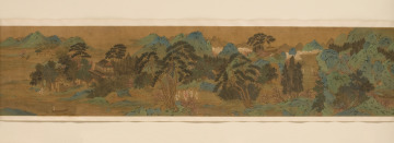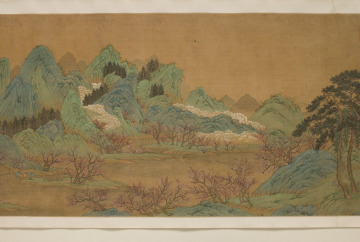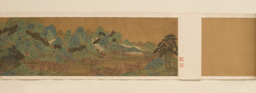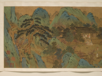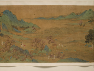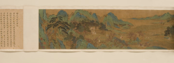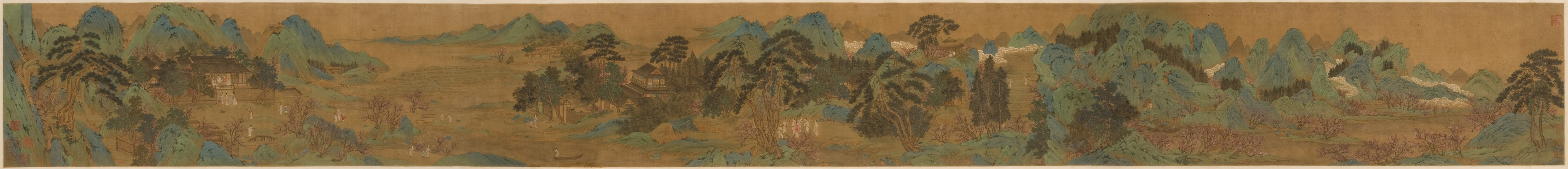 This painting was previously attributed to the Ming-dynasty artist Qiu Ying (1494–1552), who was famous for paintings of this literary subject. Scholars now believe this painting was made by a 17th-century copyist during the late Ming or early Qing period. The painting is followed by a colophon, an inscription which describes how the work was produced, by the mid-19th-century scholar-official Tian Renxi. The colophon includes the full text of Tao Qian’s original story written in small regular-script calligraphy (kaishu). It was written upon the request of Tian’s scholar-official friend Xue Huan (1815–1880), who was in charge of foreign affairs at Shanghai from 1857 to 1863.