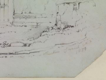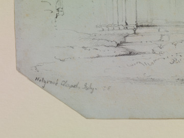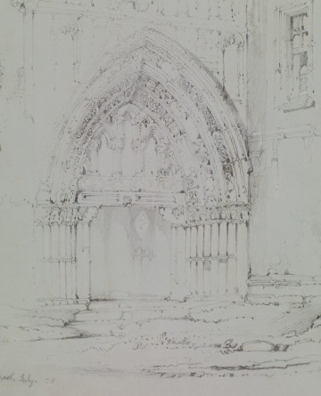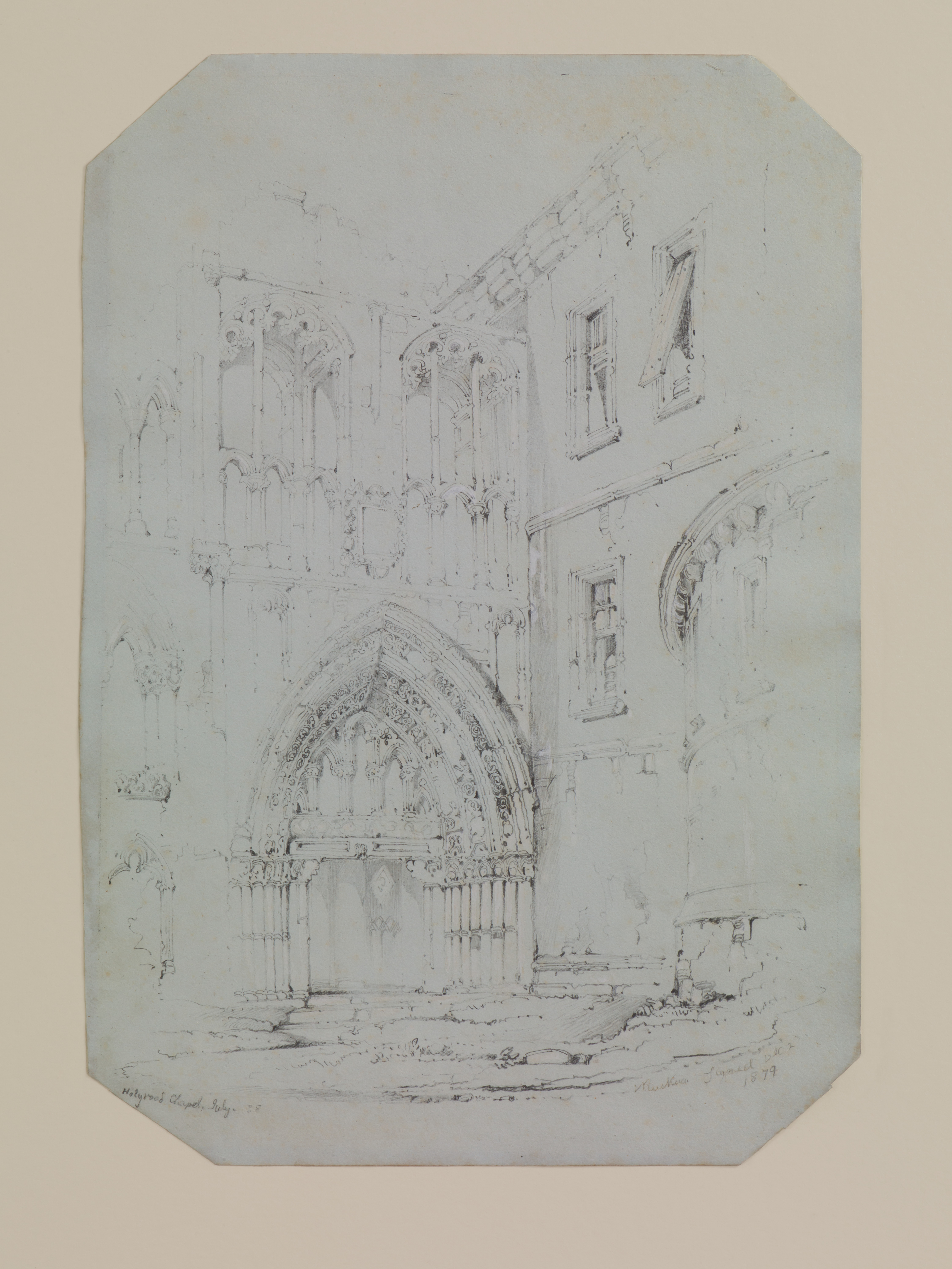 This drawing focuses on the extensive ornamentation on the facade and entrance portal of the Holyrood Chapel in Scotland. Made in 1838, the drawing was meant to serve as historical documentation. While meticulous in its outlining of forms, this drawing only communicates the linear qualities of the building’s design.
