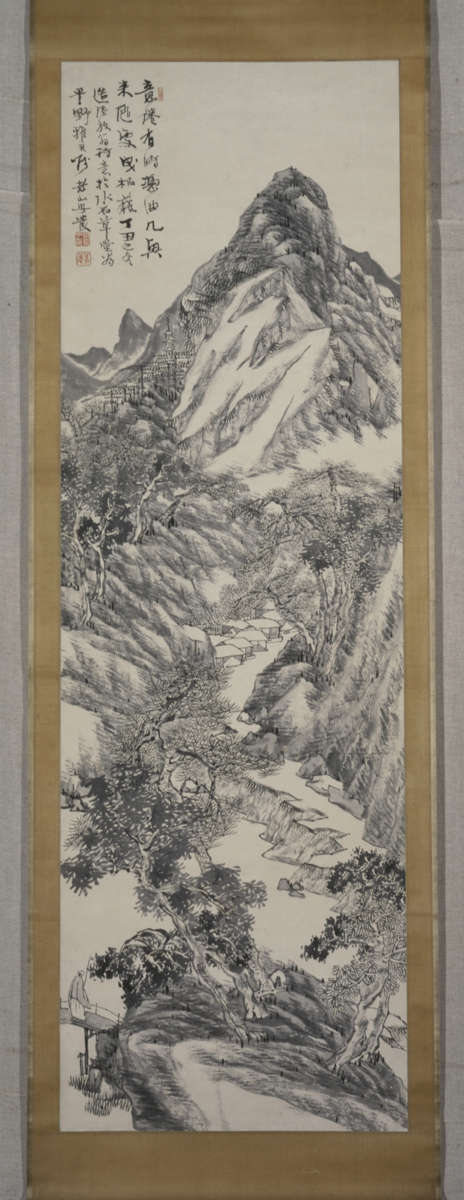 In the lower left of this landscape, a small figure pauses on a bridge to contemplate the journey ahead. High above the cluster of houses in the mid-ground, a lofty spire indicates his destination: a mountainside temple. Two lines of verse by the Chinese poet Lu You (1125–1210) complement the theme. The right to travel abroad was strictly forbidden during most of the Edo period (1603–1868). Yasuda Rozan, however, was impatient to visit China, which he regarded as the cultural heartland of literati painting. With the help of Dutch missionary Guido Verbeck (1830–1898), Rozan and another painter, Ishikawa Kansen (1844–1917), set sail from Nagasaki for Shanghai in 1867, the year before the travel ban was lifted. Rozan remained in China for seven years, studying under the Shanghai master Hu Gongshou (1823–1886), before returning to Japan in 1873, where he enjoyed a short but successful career as a professional painter. Inscription: When feeling tired, I sometimes lean on a crooked table. When in the mood, I drag a cane here and there. The winter of 1877 at the Thatched Hall of Water and Stone; a landscape emulating Lu Fangweng’s poetic flavor painted at the request of Mr Hirano. Rozan An Yo.
