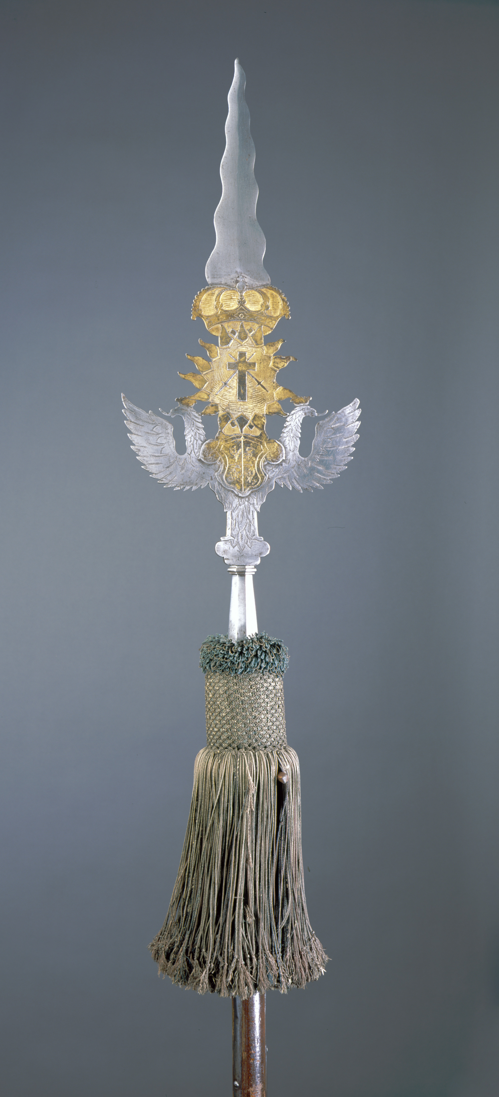 This purely ceremonial arm was carried on important court and state occasions by an officer of the Noble Guard. The Hapsburg double eagle on the blade is believed to allude to the marriage that united Saxony-Poland and Hapsburg Austria.