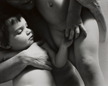 Nicholas Nixon's views of his family reveal a profound warmth and intimacy. There is also a visual playfulness inspired by the spontaneous and uninhibited poses of his children. This composition shows his wife, Bebe, and his two children, Clementine and Sam, tenderly interlocked through their arms. Nixon's framing verges on abstraction, leaving the viewer to contemplate the tangle of limbs that crisscross the picture frame.