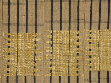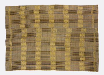 This wrapper is made of fourteen woven strips of fabric. Traditional Yoruba weavings often begin with indigenous cotton spun and dyed by women. The yarns are then woven into strips of cloth by men, and the strips are stitched together by women to form the completed garment. Changes in fashion and taste provide a wealth of abstract decorative patterns which are frequently named after political leaders or proverbs. While incorporating contemporary influences, the cloth has powerful traditional roots.
