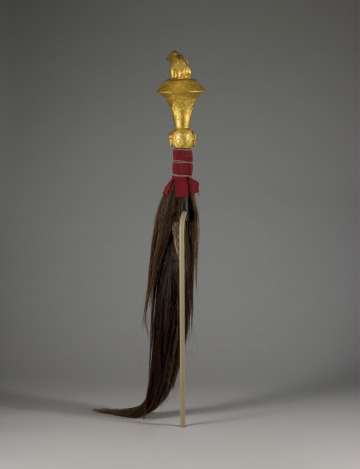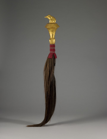 Both the gold material and the elephant crowning the handle of this whisk suggest the qualities of strength, stability, and temperance required of a strong leader. A fly whisk is one of the principal chiefly emblems belonging to leader of a Baule community. Gold objects, along with other emblems such as stools or chairs, are strongly associated with ancestors. Leaders derive the authority to rule and guidance to do so thoughtfully and successfully from the ancestors.