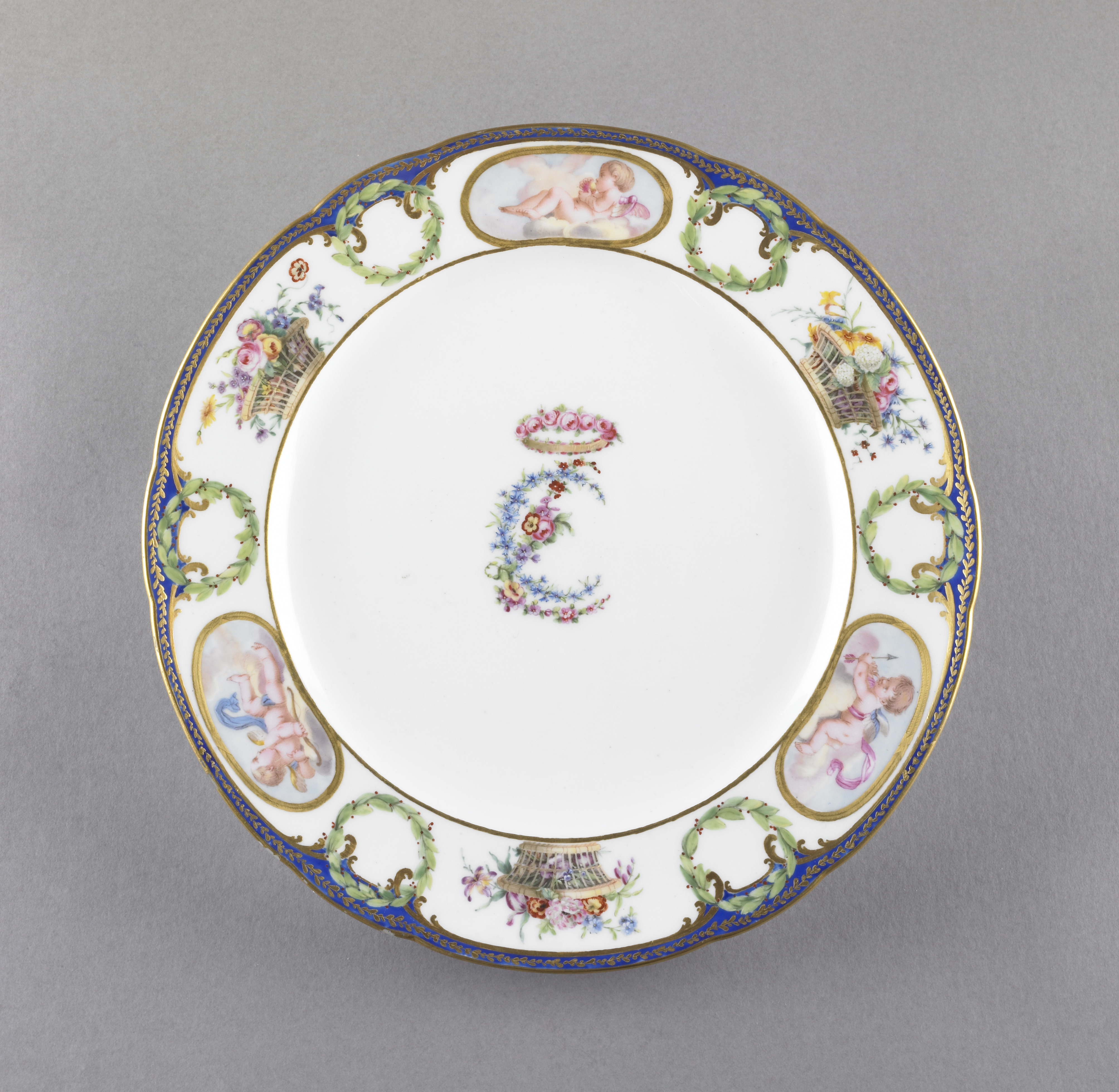 This white porcelain plate is decorated with a cobalt blue border enhanced with gilding. The outer design depicts putti (small cherubs) in clouds, interspersed with baskets of flowers and laurel wreaths. In the center are interlocking floral and foliate initials.