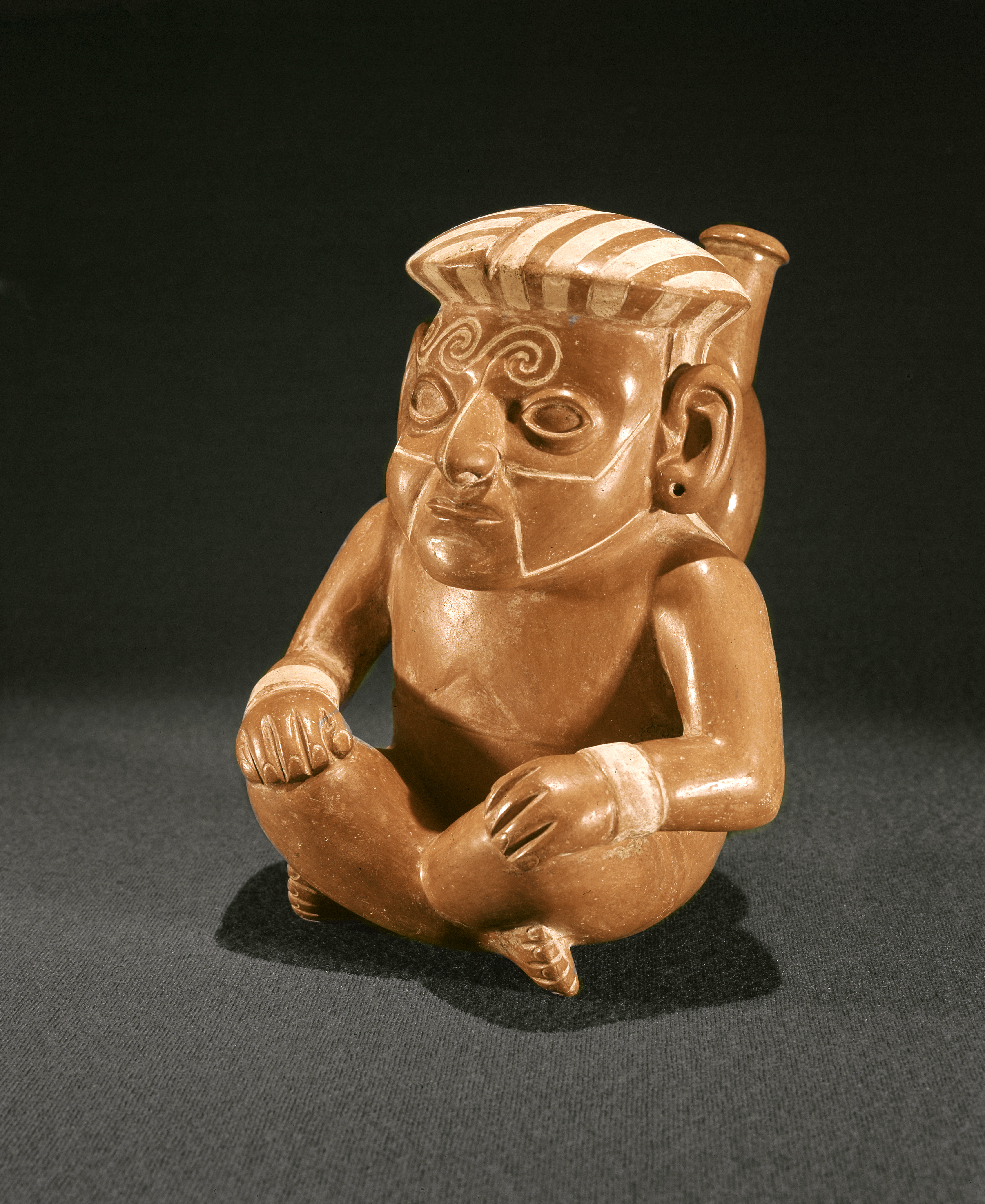 The distinctive red and white striped hat and scroll motif on the forehead of this figure identify this vessel as the Dos Cabezas substyle of Moche ceramics. This particular style was produced at the sites of Dos Cabezas and La Mina, located at the delta of the Jequetepeque River on the north coast of Peru. While this vessel was individually modeled by a skilled artisan, it was depicted in a standardized and consistent manner. The individual represented on this vessel is always shown seated with both hands resting on the knees, wearing a striped dome-shaped hat, and facial scroll designs. Similar vessels recovered from archaeological investigations were found with delicate bone pins in the ears; it is likely the perforations in the ears may have once held the same.