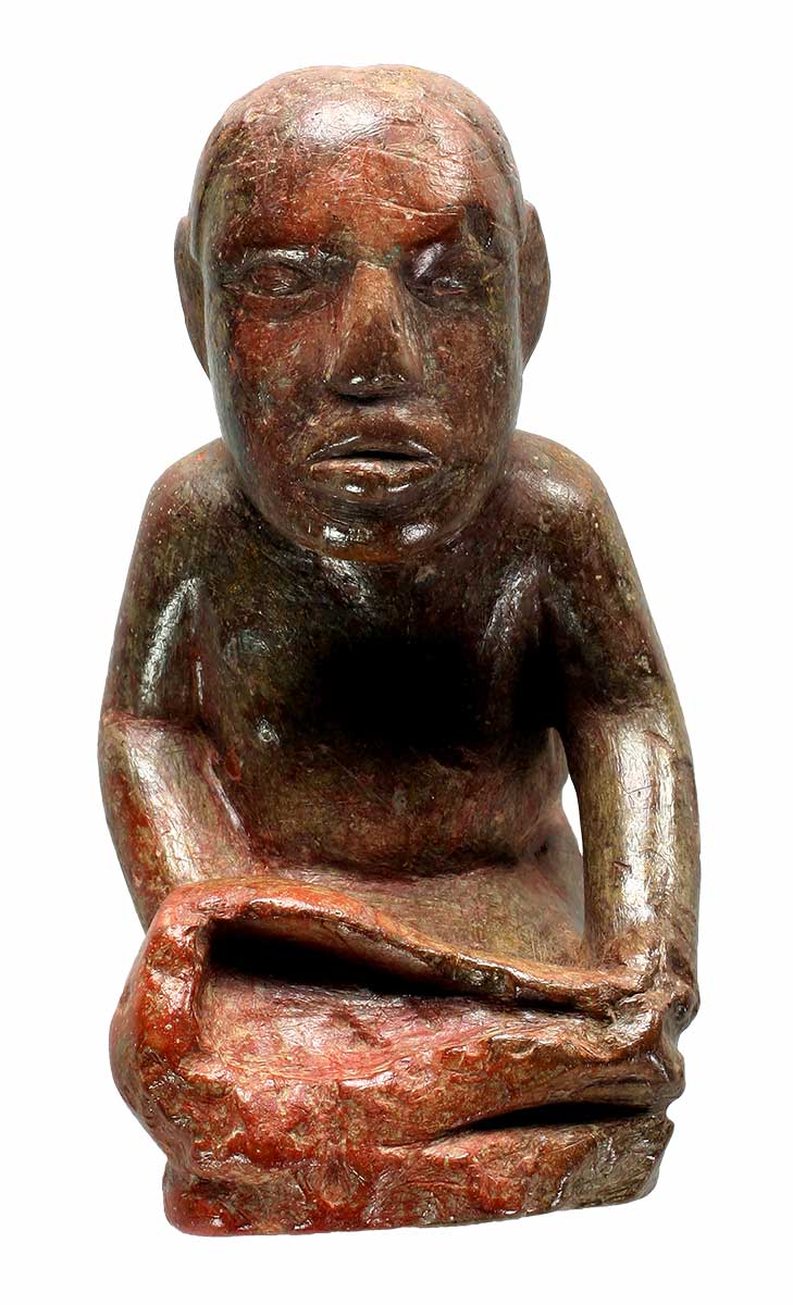 Mississippian artist; Kneeling Female Figure with a Shell, or Exchange Avenue Figurine, c.1100–1200; Missouri flint clay; 3 7/16 x 1 3/4 x 1 15/16 inches; Courtesy of the Illinois State Archaeological Survey 2021.10