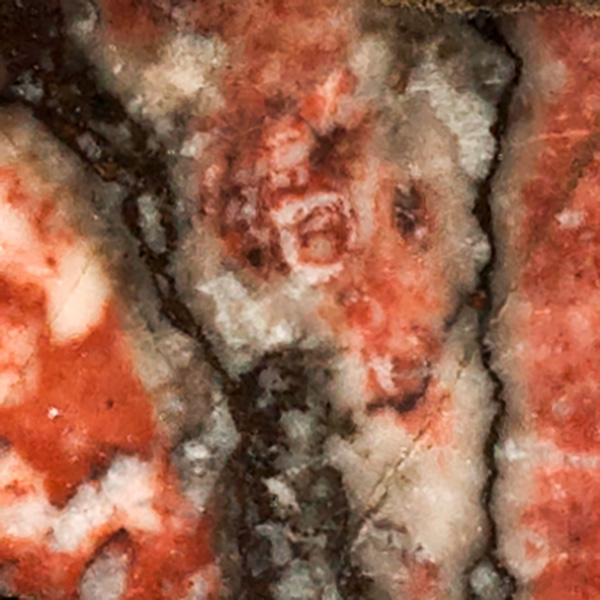 Verona “marble” refers to limestones derived from the Verona area of Italy. The deep red colors are due to the mineral hematite. The rock was fragmented and individual pieces coated and cemented by white calcite. Some samples of red Verona “marble” have been weathered and the red hematite converted to more yellowish iron hydroxide.