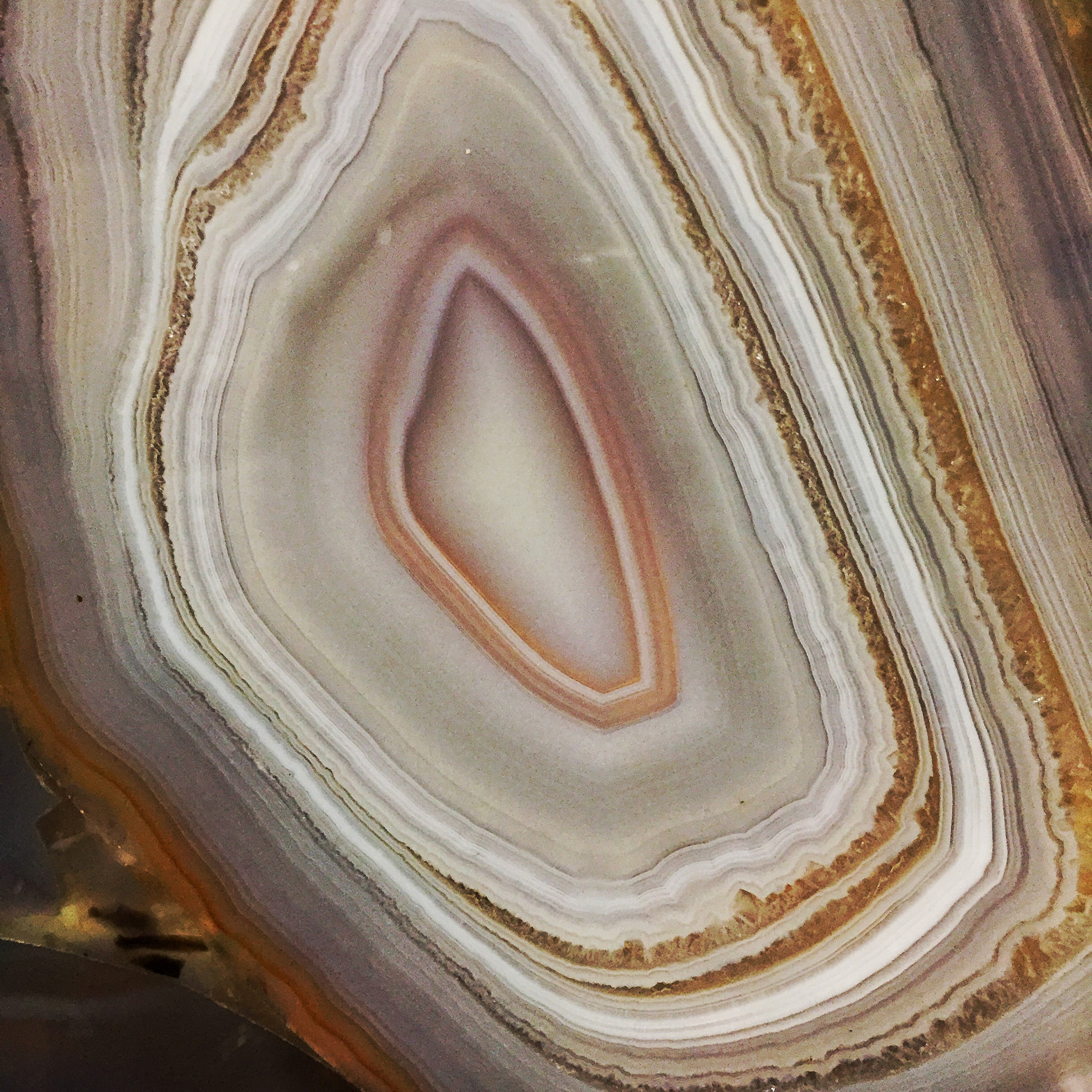 Known for its fine repetitive banding, agate is a tough rock composed primarily of silica minerals, dominated by quartz. The vast majority of agates crystallize from warm groundwaters that fill cavities in volcanic rock. Fine laminae line the walls of the cavity, growing concentrically inward. Partially filled cavities end up as geodes, while completely filled cavities may be called nodules. The often multicolored laminae in agates are frequently caused by natural iron and manganese impurities, although artificially colored agates are not uncommon. Agates may get fractured and subsequently healed, with quartz fillings producing veins that cut across the fine layers.