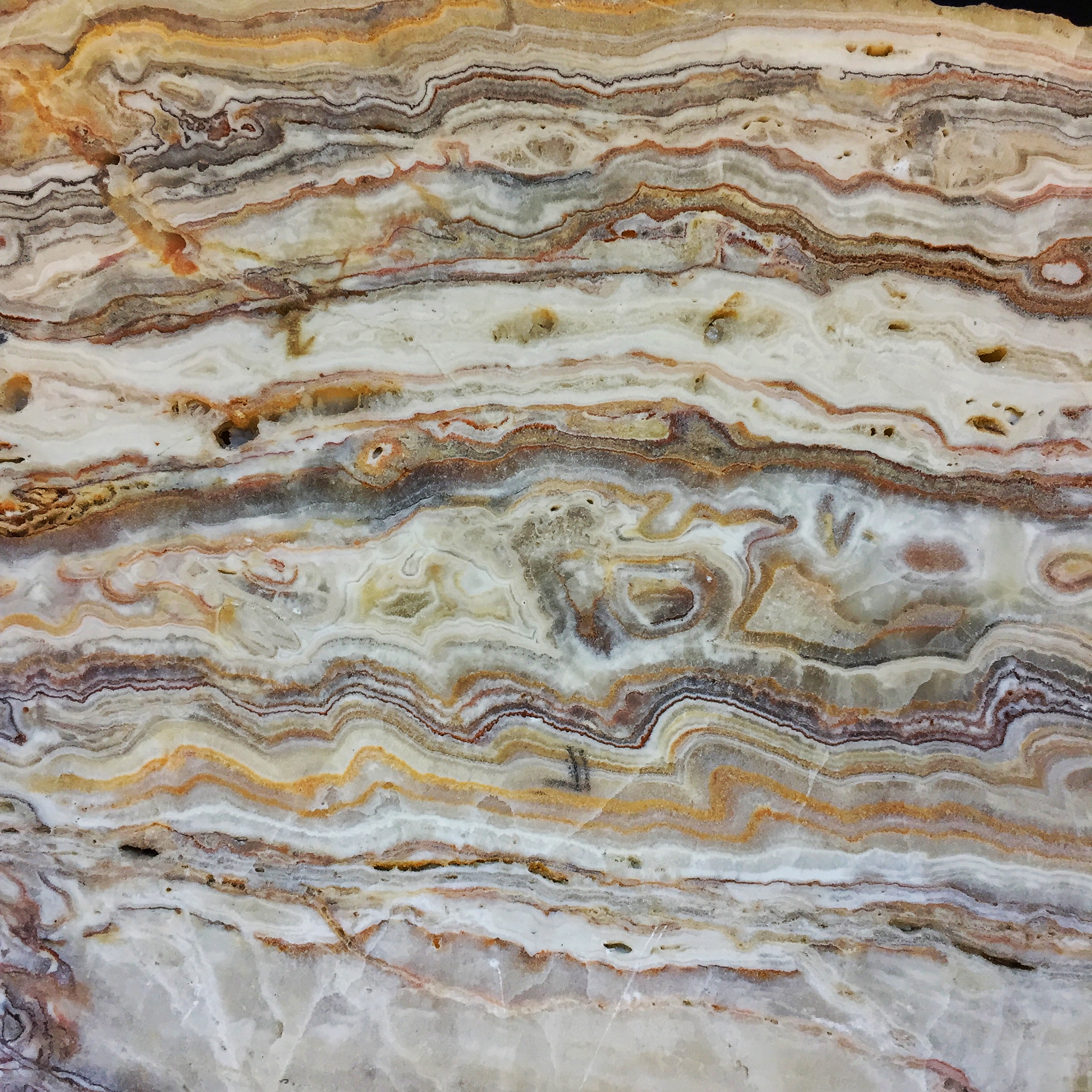 Also called “Egyptian alabaster,” “calcite alabaster,” “onyx marble,” or “oriental alabaster” in the stone trade, this rock is not true alabaster in the geologic sense because it is not made of the mineral gypsum, a calcium sulfate. Instead, it is made of the mineral calcite, a form of calcium carbonate. Texturally, however, it looks very similar to alabaster because it forms in a similar way—by precipitation of fine layers primarily from springs or in caves, also similarly colored by iron impurities. The resulting rock is called travertine by geologists—the same material that makes stalactites and stalagmites in caves. Whereas true alabaster can be scratched by a fingernail, travertine cannot.