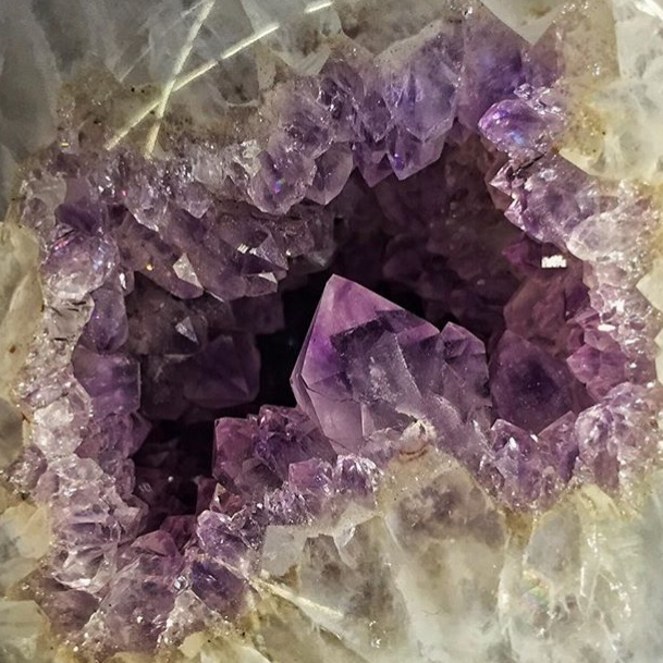 The variety of quartz that is purple, amethyst owes its distinctive color to small amounts of iron dispersed in the quartz. However, iron impurities alone will not make amethyst; iron with a charge of +3 will make the quartz yellow. But if the iron is irradiated with gamma rays produced by the decay of radioactive elements naturally found in the rocks, it may achieve a charge of +4, which then imparts the purple color. Amethyst crystals usually form in voids in volcanic rock and are commonly associated with geodes, agate, and quartz veins. As such, amethyst crystals often occur in layers of variable crystal size.