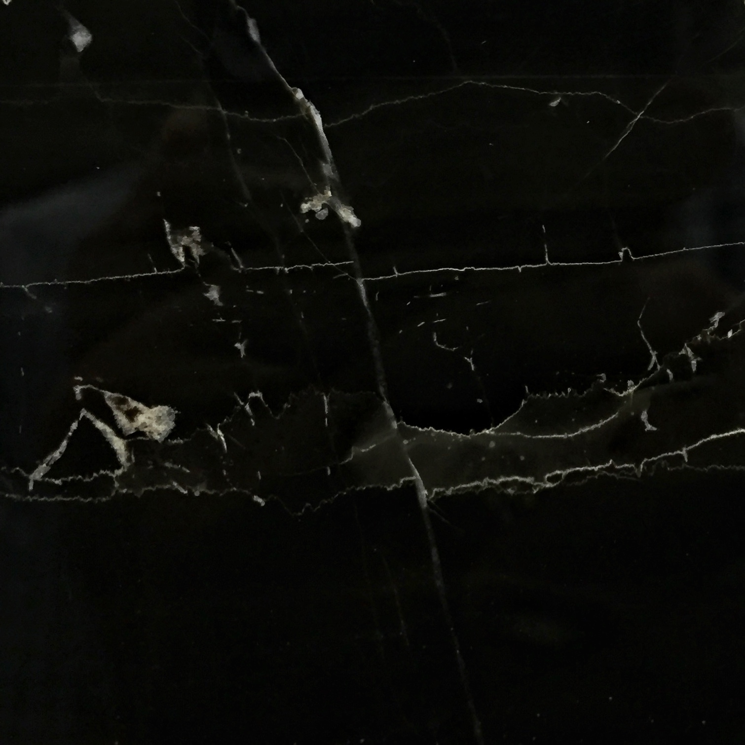This rock is known for its deep black color and its excellent shine when polished. A rock, or anything for that matter, will appear black, even under illumination, if the material contains some substance that will absorb all the colors of the incident light. Carbon-bearing organic matter is great at absorbing light. Just like very dark, organic- rich soil, Belgian “marble” is limestone that contains abundant organic matter compared with other limestones. Some samples of Belgian “marble” may have veins of white calcite, which filled fractures and lacked the organic matter that darkened the host rock.