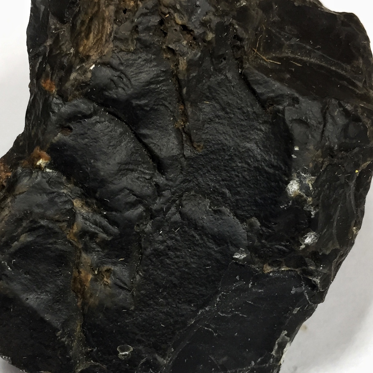 Born from volcanoes, obsidian forms from magmas rich in silica that did not have time to crystallize well. It is mainly volcanic glass. The black color is often due to numerous dispersed microscopic crystals of black magnetite. Obsidian may have white or gray streaks, which are often bands of microscopic crystals or bubbles that become aligned as the viscous lava comes out of the earth like toothpaste. Streaks of red in mahogany obsidian are due to oxidized bands rich in hematite. White “snowflakes” or dots, present in some obsidian samples, are aggregates of crystals—mostly varieties of silica and feldspar—that formed in the unstable glass after eruption to the earth’s surface.
