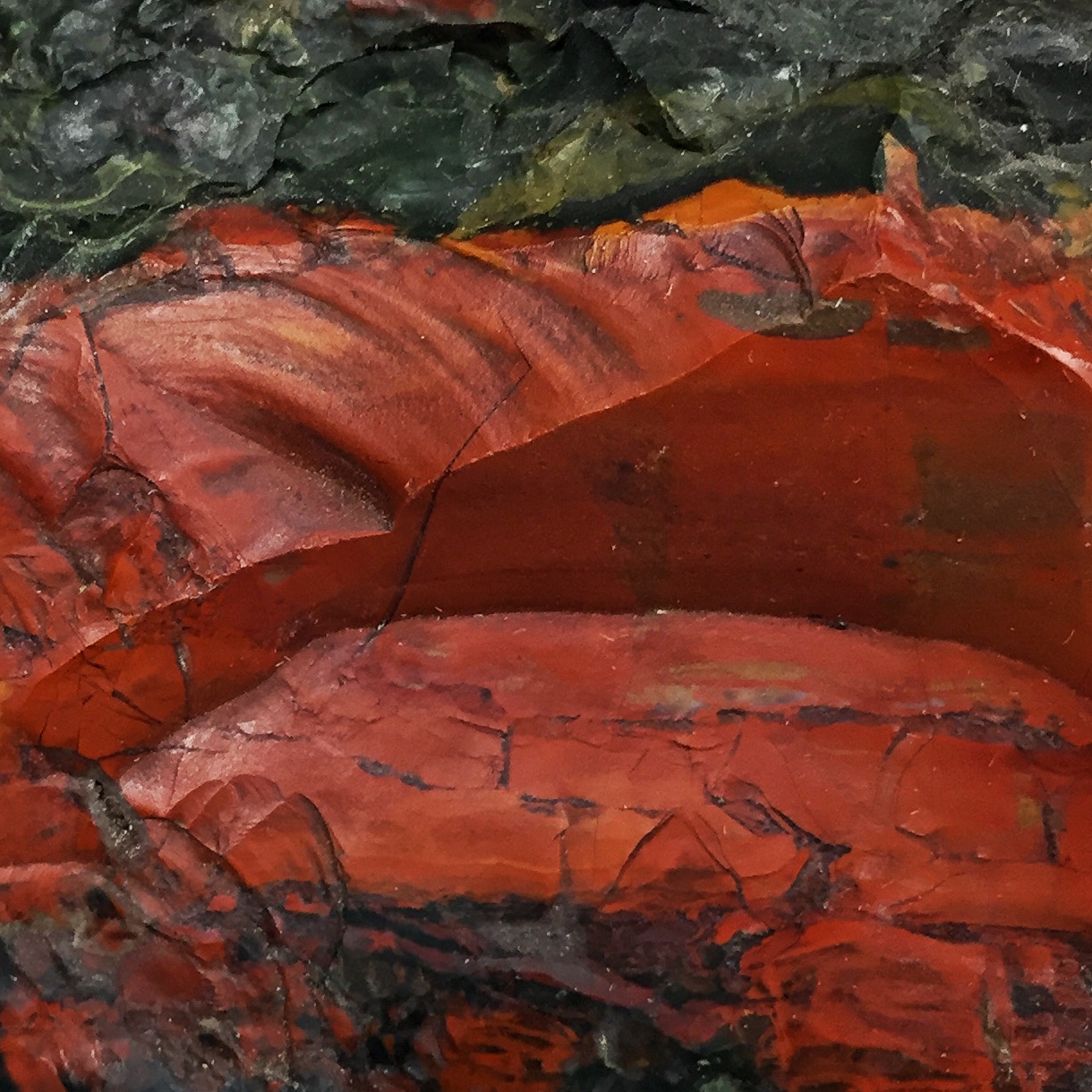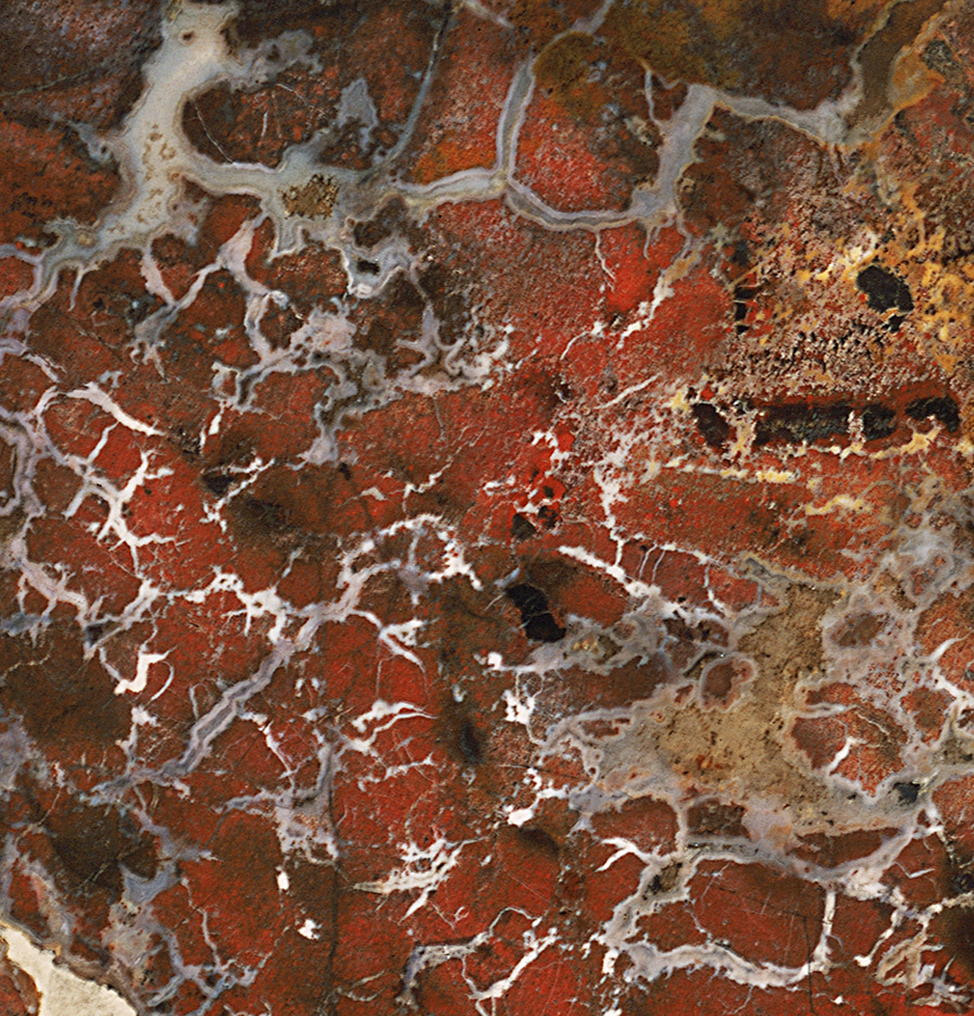 A tough rock composed of very fine-grained, microscopic quartz crystals with variable amounts of iron oxides and hydroxides is called jasper. Depending on the amounts and types of iron oxides/hydroxides and other impurities, jasper can have hues of yellow, orange, brown, red, green, and black, with red being the most common. Most jasper originates as sedimentary rock on the ocean floor, formed from the remains of tiny marine creatures that make their shells from silica. Jasper may be fractured by earth’s crustal movements to varying degrees, with veins of white quartz filling the fractures or spaces between the broken fragments.