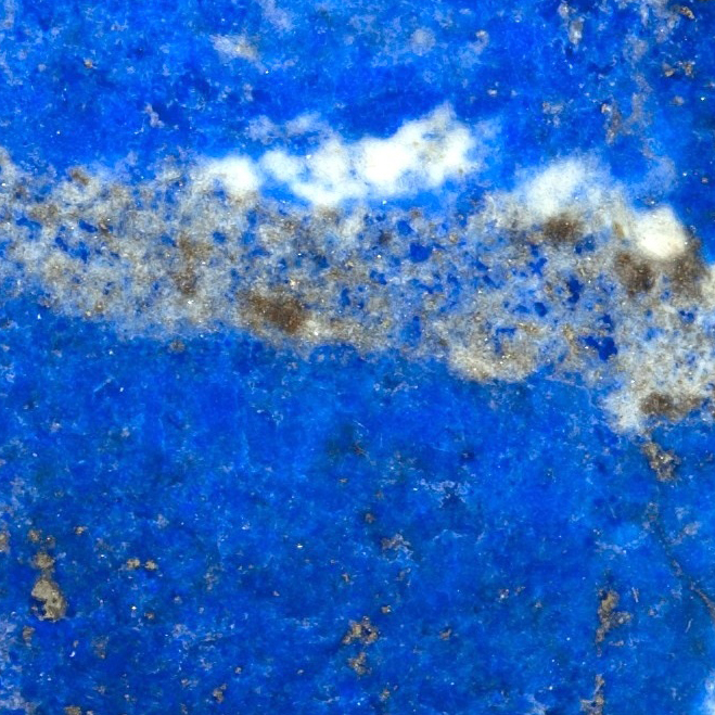 Also called simply lapis, this somewhat rare and beautiful rock owes its blue color to the mineral lazurite, which in turn owes its color to the element sulfur. When sulfur is locked in the crystal lattice of lazurite, it causes a blue color, in contrast to the bright yellow of a pure sulfur crystal. Lapis also commonly has a sprinkling of yellow- gold pyrite and streaks or patches of white calcite. Lapis lazuli is a metamorphic rock, most famously quarried in Afghanistan, where limestones, which provided the calcite, were intruded by magma, which provided the other ingredients and the heat to produce this unusual rock.