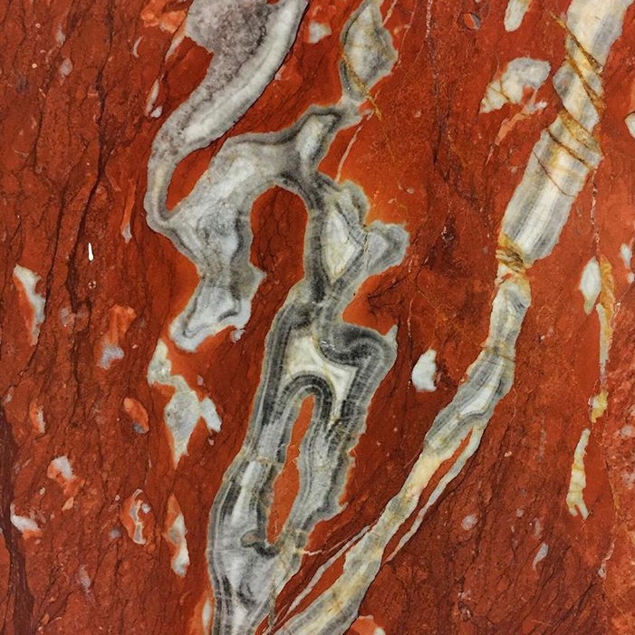 Like many other samples of “marble,” red “marble” is often really limestone—a sedimentary rock that has not been subjected to the higher temperatures required to make true marble. The red color is due to the most common cause of reddish colors in rock, the mineral hematite, a type of iron oxide. Some samples of red “marble” may have veins of white calcite that filled former fractures; others may be heavily fractured, even multiple times, into angular pieces, producing the rock called breccia.