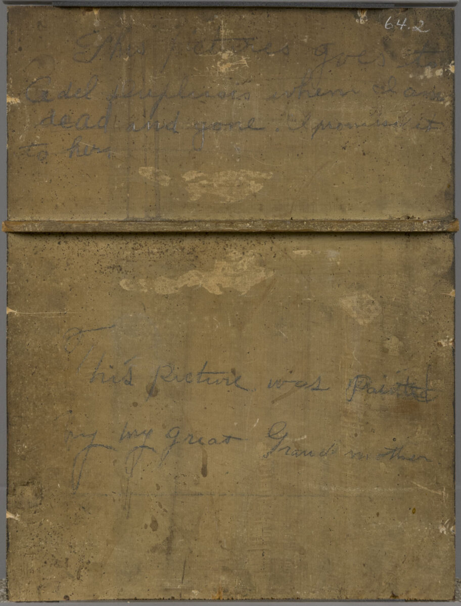 Unfortunately, not all inscriptions are as comprehensible as these. On the backside of Deborah Goldsmith’s Family Portrait (c. 1832), conservators found, “This picture goes to Adel [Duplinois] when I am dead and gone. I promised it to her,” and “This picture was painted by my great Grandmother,” both inscribed by unknown writers. These two passages raise a few big, unanswered questions. First, what is the correct spelling of the name in the first inscription? The cursive writing is difficult to interpret; “Duplinois” is an educated guess, and that person’s relationship to the artist is also unknown. Second, who wrote these passages? The differing script suggests they were written by two different people, and which of the artist’s many great-grandchildren wrote the second inscription?