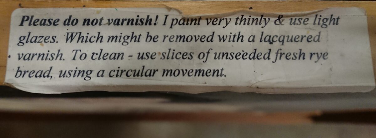With some paintings, the artists go a step further and give specific instructions for future conservators. Two paintings by Sylvia Sleigh, who was a Welsh painter active in the United States, have an artist label fixed to the back of the canvas frame stating, “Please do not varnish! I paint very thinly & use light glazes. Which might be removed with a lacquered varnish. To clean—use slices of unseeded fresh rye bread, using a circular movement.” As you may imagine, fresh rye bread is not kept anywhere near the art—for this painting, conservators use conservation-grade sponges.