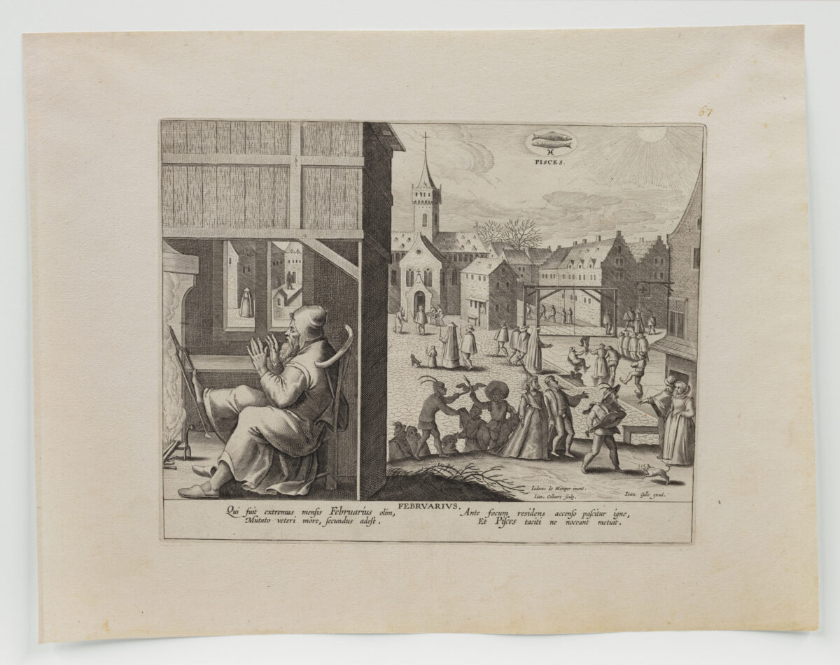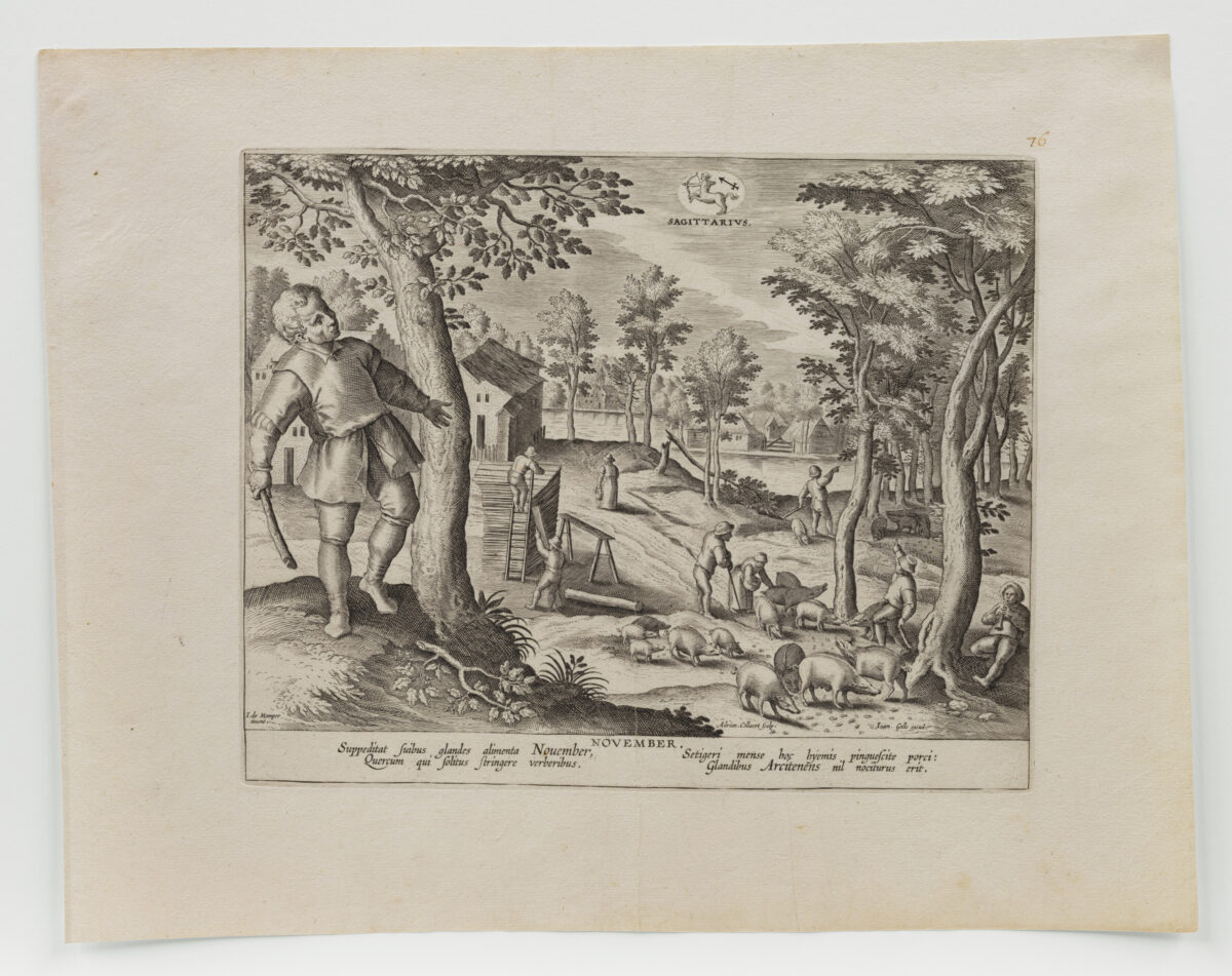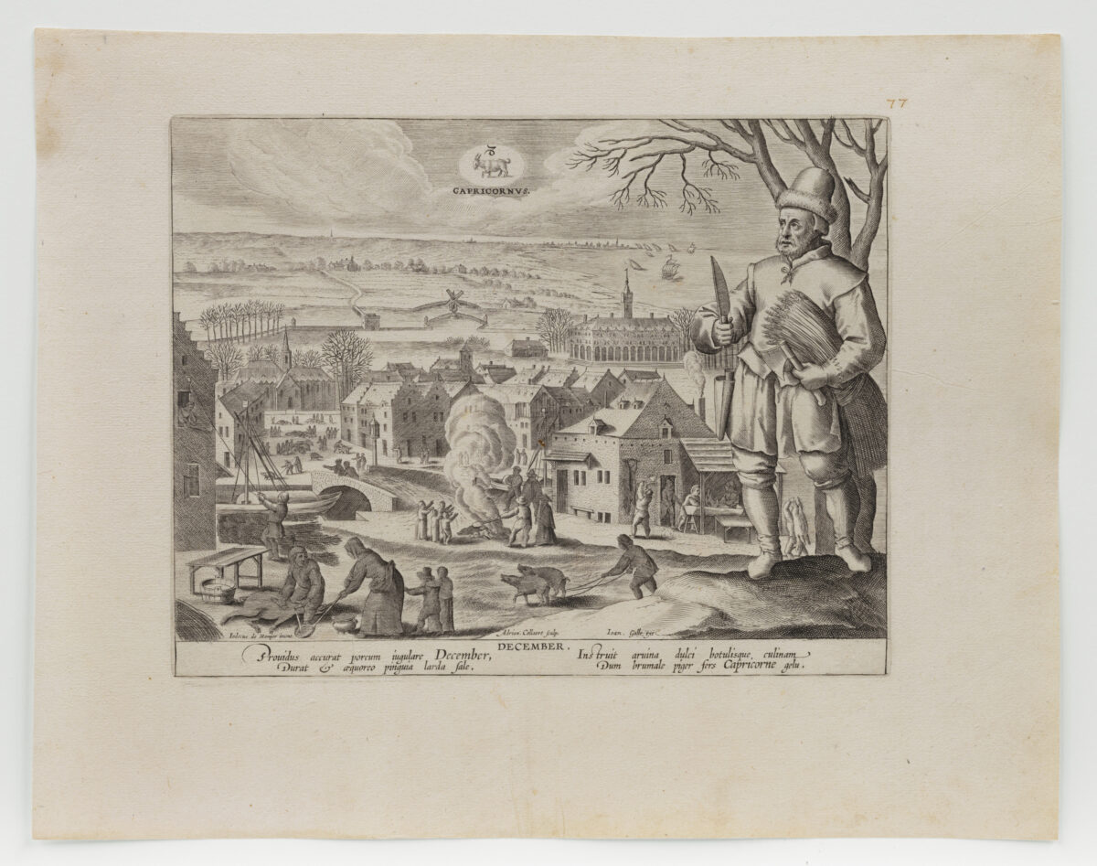 Espinosa’s portrayals of January and February, and November and December, demonstrate the artist’s skillful combination of two compositions into one painting. January–February includes the distant mountains and village street visible in Adriaen Collaert’s January, as well as the ice skaters visible in Hans Collaert the Younger’s February. November–December combines the pigs and herders from the elder Collaert’s November print and the smoke billowing from a roasting pig from his December print. The four Flemish prints are on view near Espinosa’s oil paintings in the SLAM exhibition galleries.