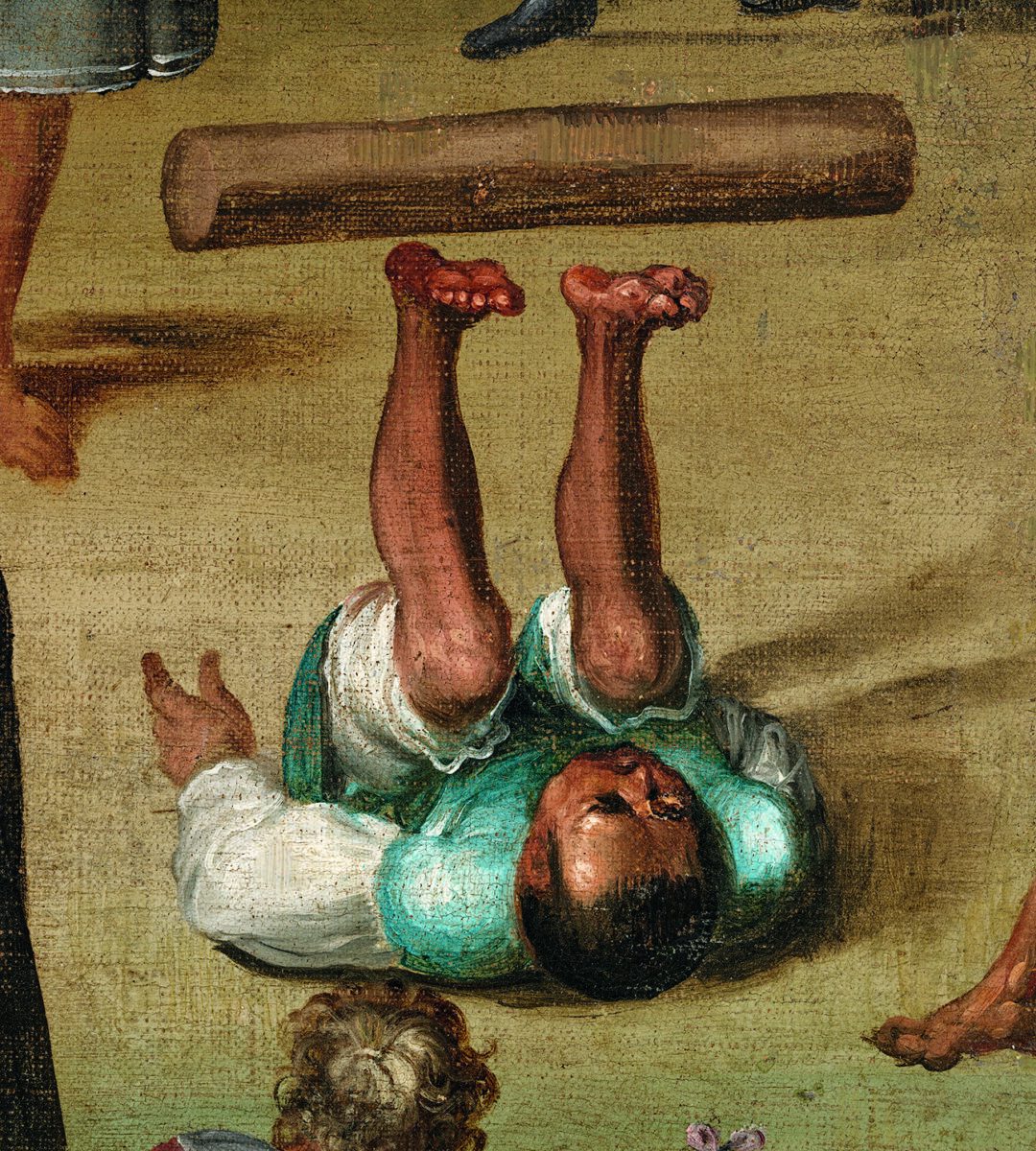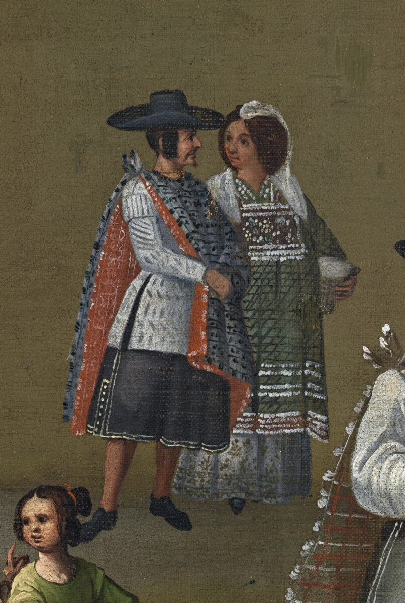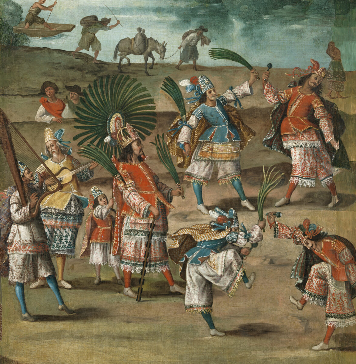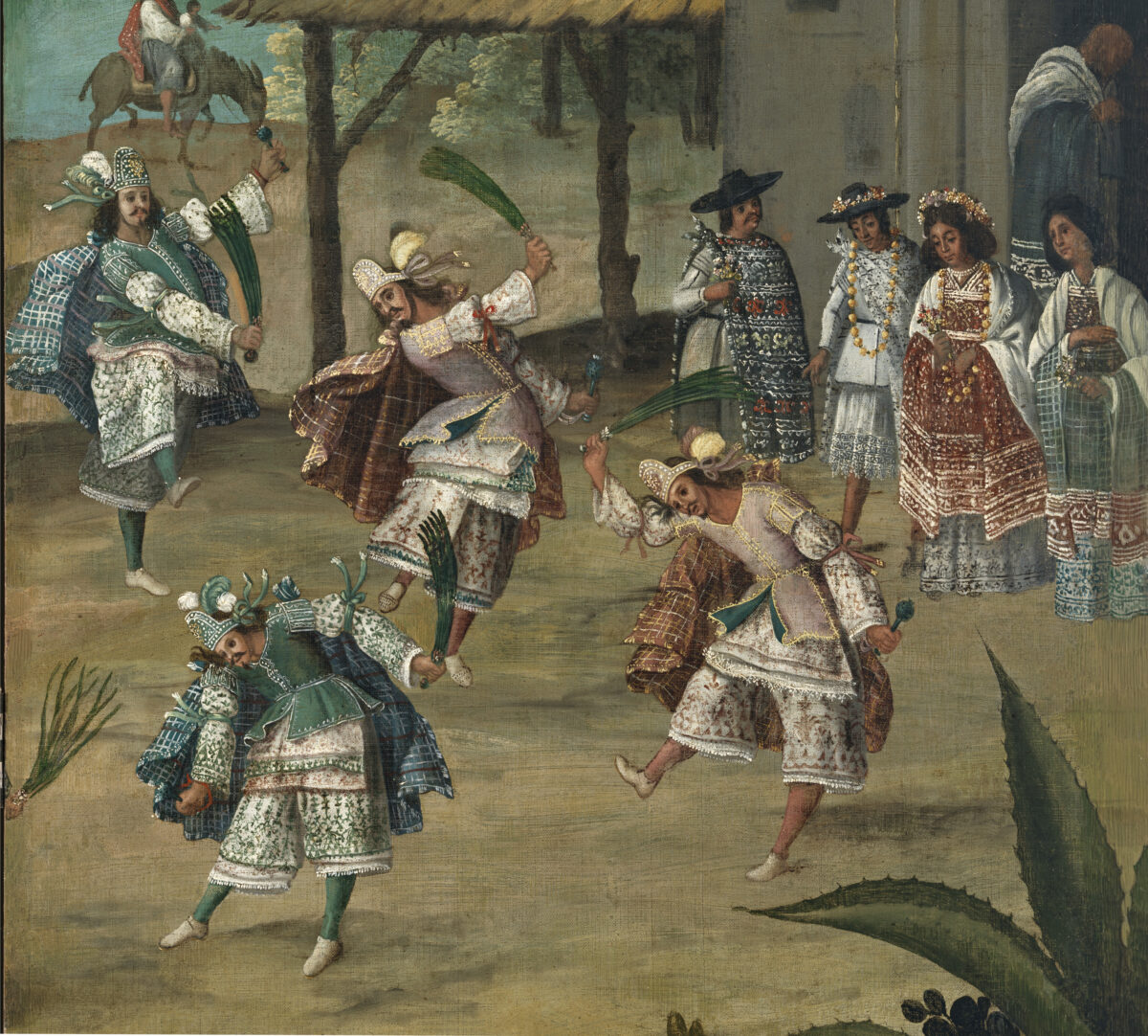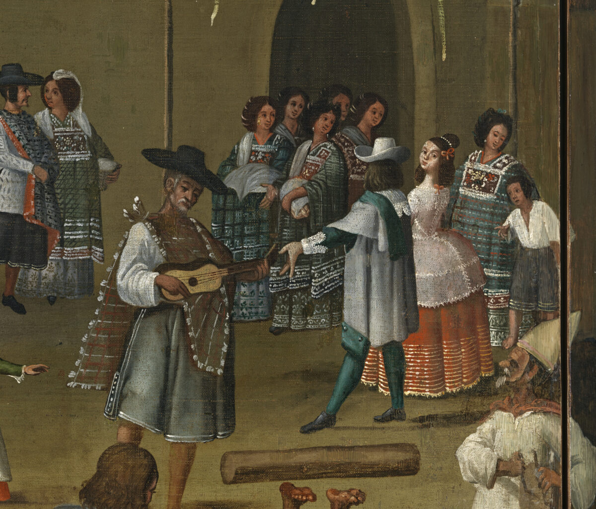 The scene probably took place in Santa Anita, Iztacalco, a famous destination in the southern part of present-day Mexico City. At right, the newlyweds are seen leaving the church, and participants wearing typical mid-17th-century Spanish clothing gather outside the bride’s house at left. Full of life, other images on the screen include a group of dancers in ornate costumes performing a mitote (or Moctezuma dance) that imitates the dance of the legendary Aztec king; figures swinging from a flying pole (palo volador); and a log, suspended in the air, being juggled by the feet of a performer.