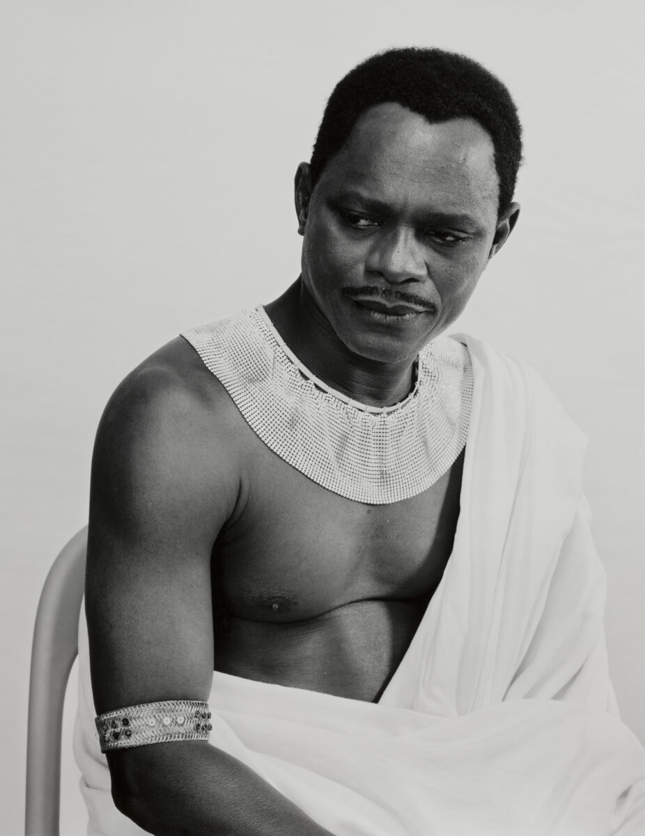 Three artists featured in the Narrative Wisdom and African Arts exhibition and catalogue use photography to honor history, bear witness, and disseminate truth. This is especially apparent in the “Leadership and Power Play” section of the exhibition, which features the distinct photographic styles of Fabrice Monteiro, Moneta Sleet Jr., and Samuel Fosso.