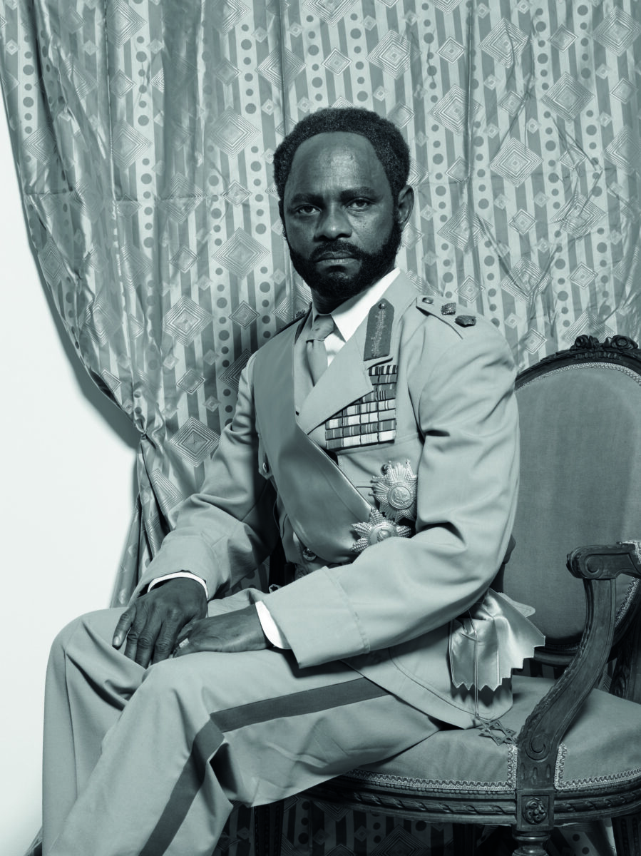 Born in Belgium and based in Senegal, contemporary multimedia artist Monteiro also uses photography to immortalize influential political leaders. However, he does so through a satirical lens. These works, while not on view in the exhibition, are featured in the exhibition catalogue. In her catalogue essay, Nichole N. Bridges, the exhibition curator and SLAM’s Morton D. May Curator of the Arts of Africa, Oceania, and the Americas, explains how the artist critiques several independence-era leaders who overstayed their welcome in the political office and abused their power in postcolonial African politics. In his series titled (P)résidant, Monteiro depicts two masculine figures of power amongst material excess. They each sit upon a throne of gold, a replica of the golden eagle-shaped throne created for the dictatorial Jean-Bedél Bokassa, who intended to rule the Central African Republic for life in the late 1960 into the late 1970s before being exiled. Monteiro alludes to Bokassa in Grand Timonier, critiquing the extravagance of his rule.