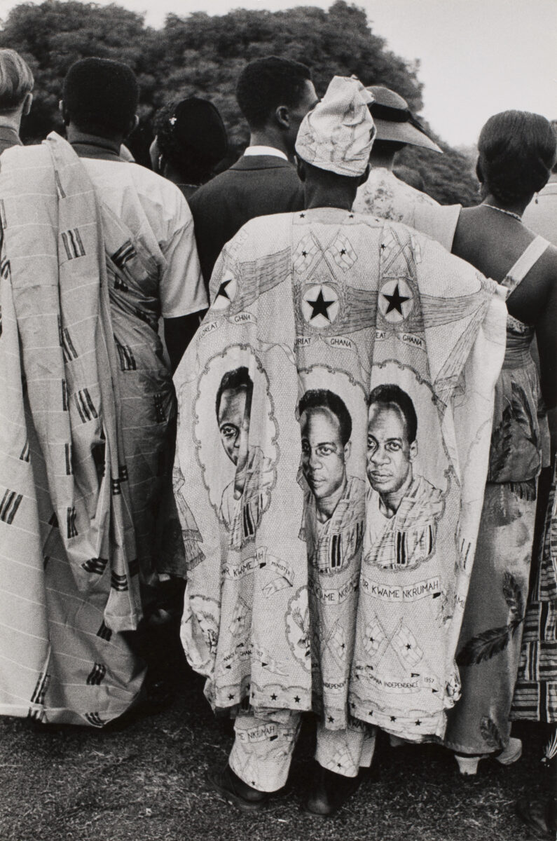 Moneta Sleet Jr., American, 1926–1996; Participant at Ghana's Independence wearing textile with portrait of Kwame Nkrumah, 1957, printed c.1970; gelatin silver print; 13 3/4 x 9 inches; Saint Louis Art Museum, Gift of the Johnson Publishing Company 446:1991; © Johnson Publishing Company Archive, Courtesy Ford Foundation, J. Paul Getty Trust, John D. and Catherine T. MacArthur Foundation, Andrew W. Mellon Foundation and Smithsonian National Museum of African American History and Culture