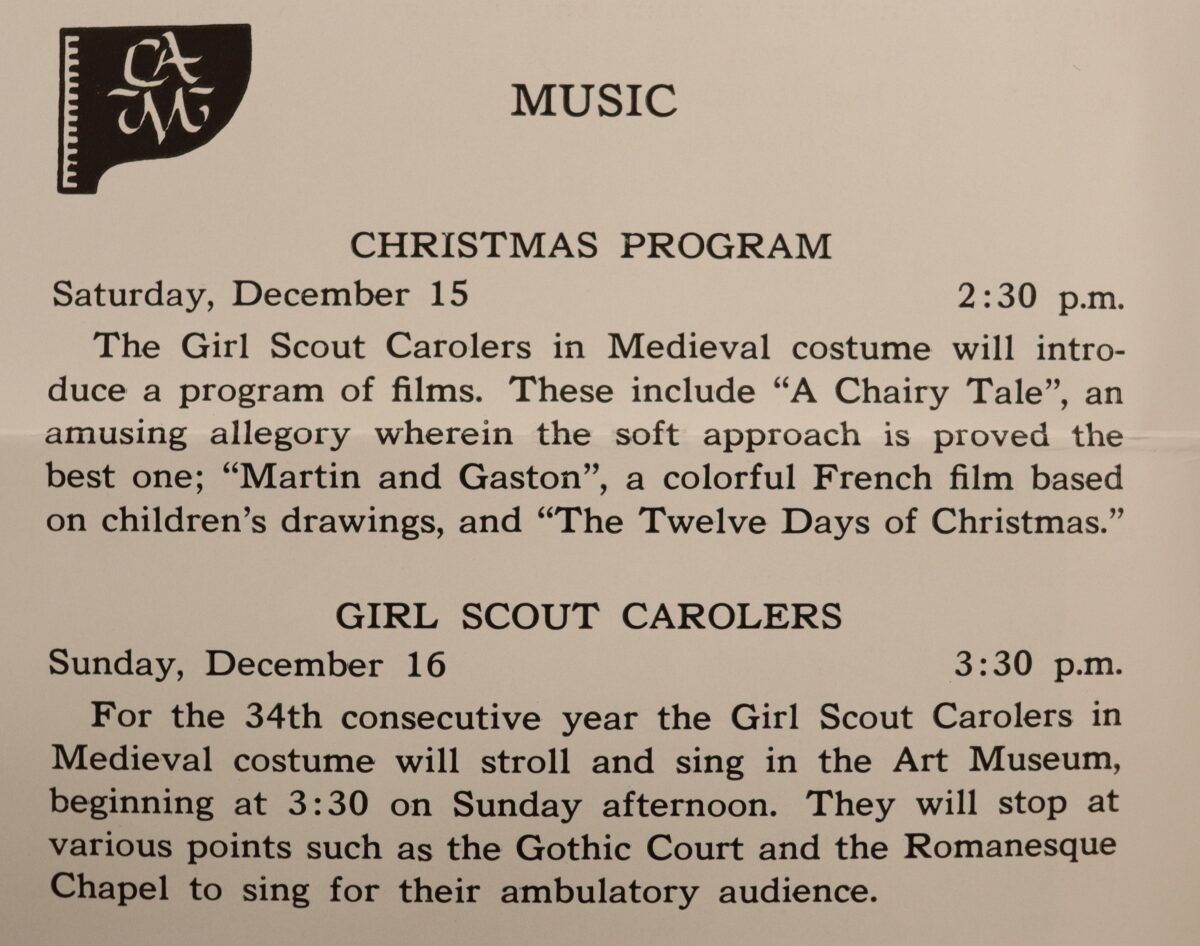 Starting with the 1929 holiday season, the St. Louis Girl Scouts annually gathered at the Museum to sing Christmas carols. Dressed in medieval costumes of red, green, purple, and blue, the Girl Scout Carolers would stroll through corridors and stop at various galleries to perform. The Morlaix Gothic Court was a popular starting location for the carolers to sing from the balcony to the audience gathered below. This yuletide caroling tradition spanned through the 1960s.