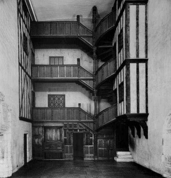 On Tuesday, December 8, 1931, the Museum unveiled the Morlaix Gothic Court—a French period room highlighting the Museum’s medieval collection—just past what is now called Grigg Gallery. The Morlaix Gothic Court’s signature oak staircase, half-timbering work, and branching balcony with linenfold paneling provided an ideal location for one of the Museum’s longest-running holiday traditions at the time: Girl Scout Carolers.
