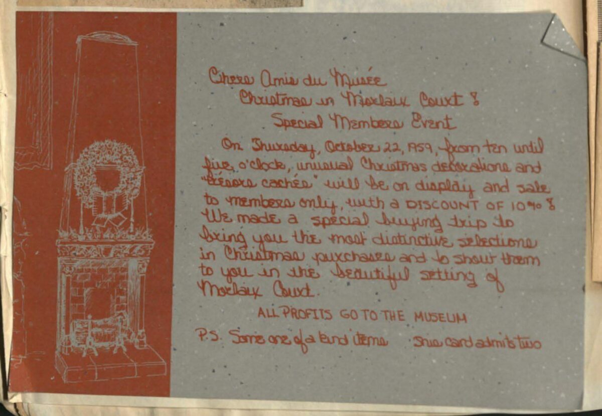 The Morlaix Gothic Court also served as the venue for the Museum Shop’s Christmas Sale in the mid-20th century. Operated by the Friends of the Museum, the sale featured holiday ornaments, decorations, and unique imported goods procured during special buying trips. The 1959 Christmas in Morlaix sale, for example, included hand-carved Swedish decorations, Italian tree lights, and aluminum puffs (a type of lighting fixture). An image of a 17th-century, limestone French fireplace in the Morlaix Gothic Court was incorporated into the 1959 invitation to the Christmas Sale event, shown below.
