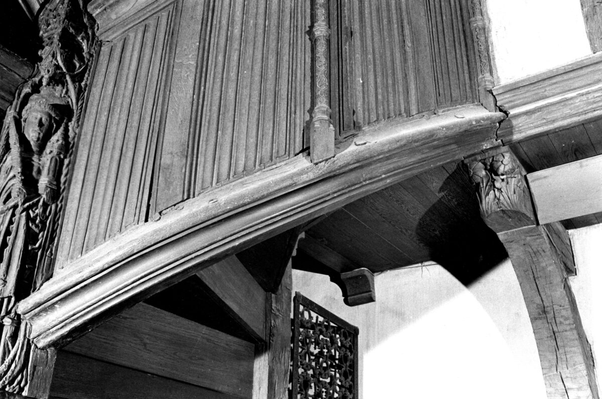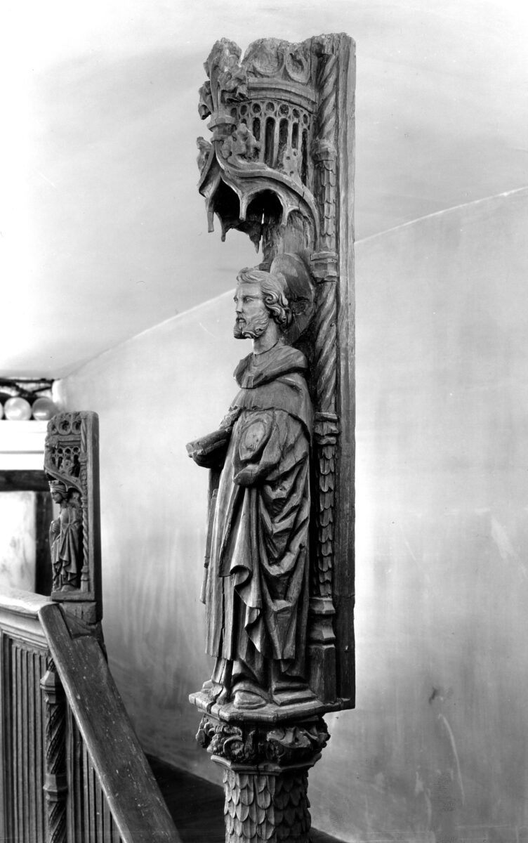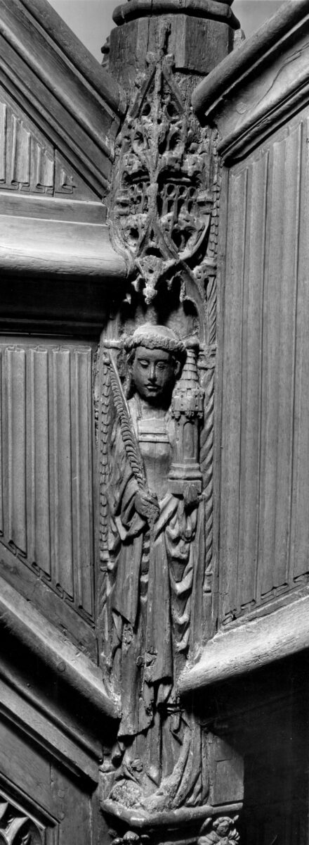Reminiscent of folded cloth, a linenfold pattern covers the flat panels of three branching balconies. A newel post—the stair’s central support beam—is carved from a single long piece of timber. Relief foliage decorates the length of the post: Starting from the bottom, the reliefs depict St. Barbara, St. Catherine, Mary, and Jesus.