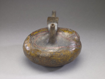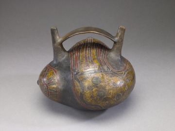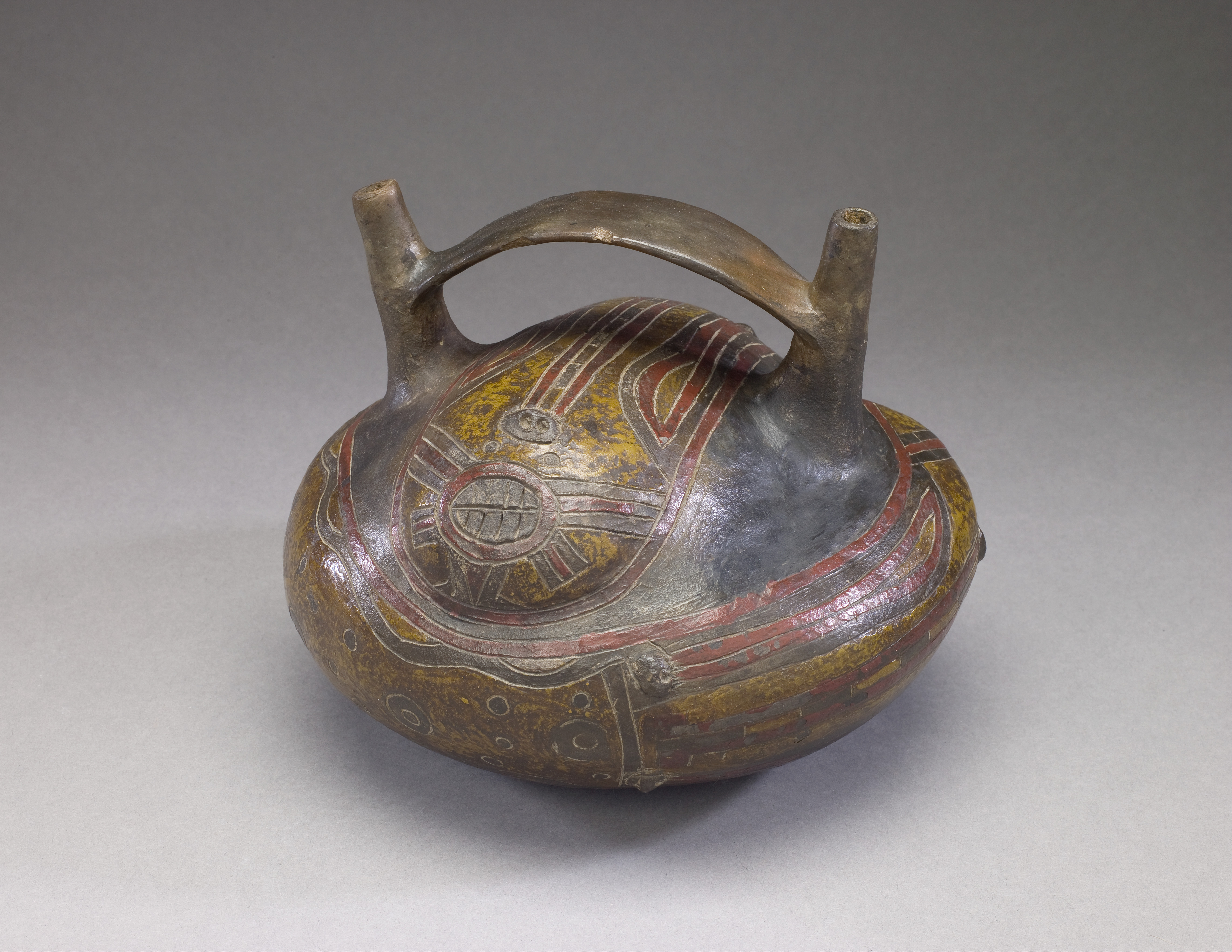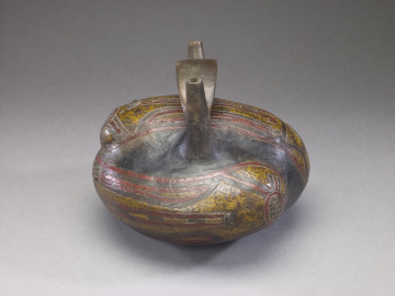 The dull and powdery appearance of colors on Paracas ceramics is a result of the deterioration of resinous pigments applied after vessels were fired. The paint was originally very smooth and shiny, yet extremely fragile. Over time, exposure to heat or excess moisture would cause the paint to blister and fade. Although rare, when two-headed snakes occur in nature, both heads usually appear at the same end of the snake. Depictions of double-headed snakes in Paracas material have a head at both ends, altering what is found in the natural world and making this vessel unique. The double-headed snake is a motif more common on Paracas textiles than ceramics. The presence of whiskers and pelt markings on the snake reinforce the importance of feline iconography.