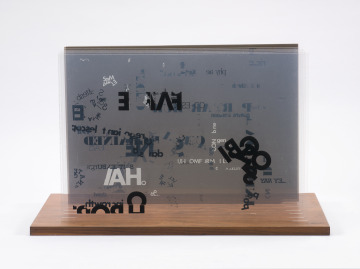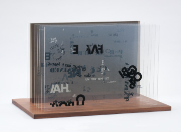 The Plexiglas sheets of this object, which was created according to the rules of chance, can be installed in any order. Composer John Cage famously employed chance in his music to remove personal taste and choice. To determine what would be printed on the Plexiglas sheets, he subjected a series of 46 questions to a coin toss, following the I Ching, the Chinese Book of Changes. Cage used diagrams, the questions, and The American Dictionary (1955 edition), to determine all variables, including what word to use and why some of the words are in fragments.