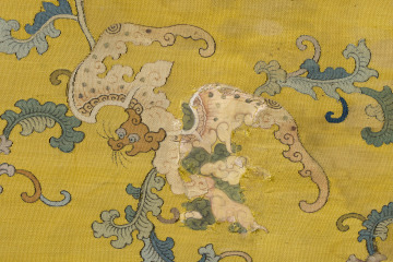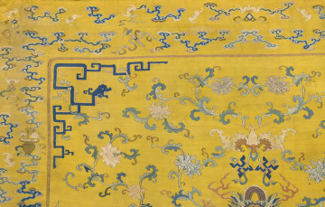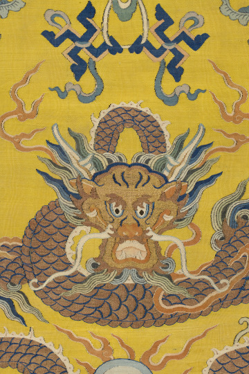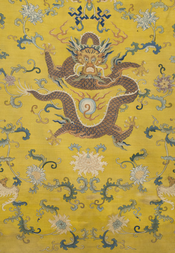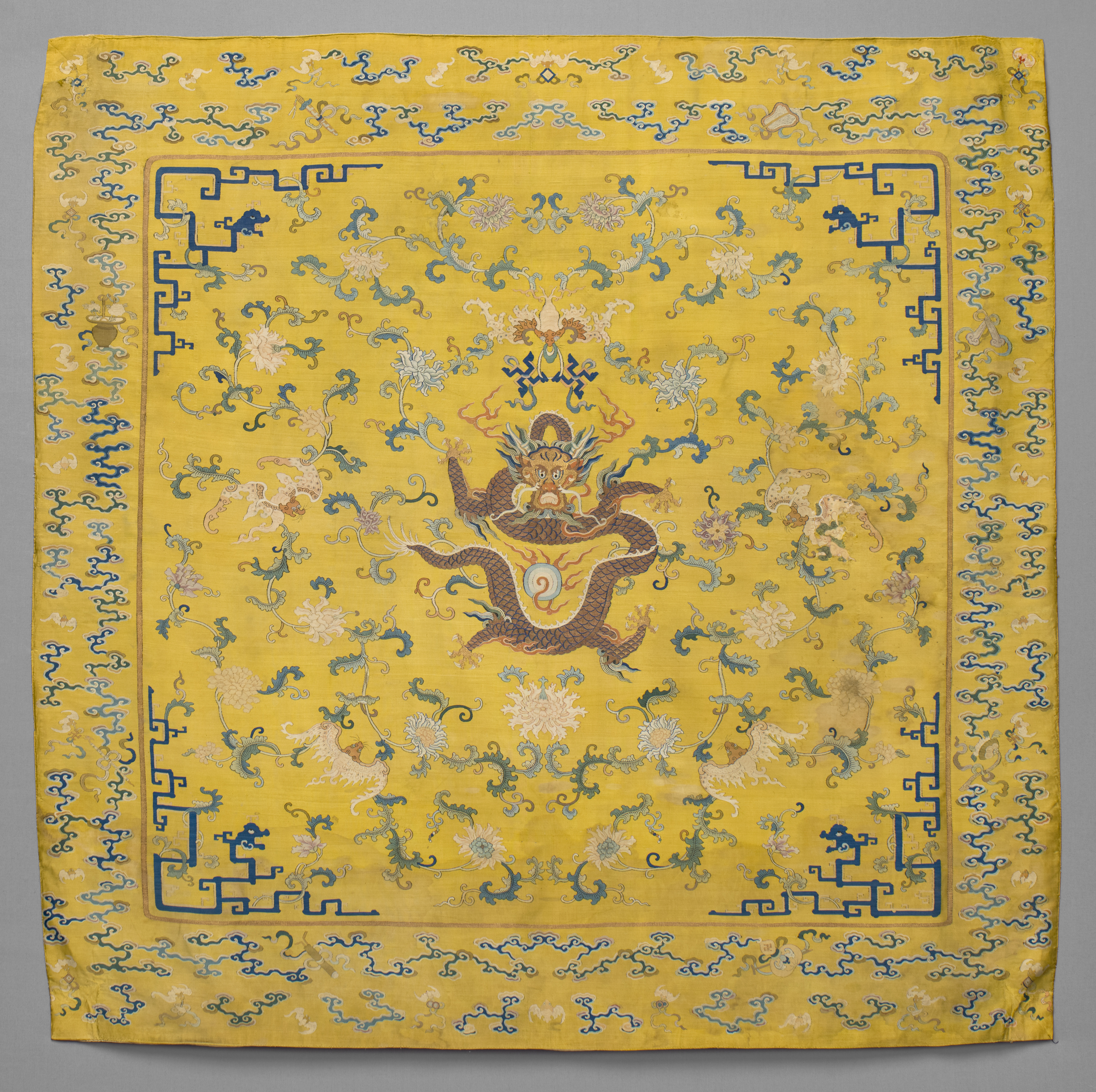 Imperial Chair Cover with Design of Five-Clawed Dragons and Bats amidst Peony Scrolls and Border with the Eight Daoist Emblems and Multicolored Clouds