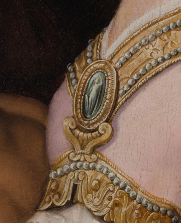 This biblical heroine’s strong arms and angled shoulders create lively diagonal lines that enhance her exaggerated musculature. Judith came to the rescue when General Holofernes and the Assyrian army laid siege to her city of Bethulia. Boldly infiltrating the Assyrian camp, Judith dined with Holofernes and, once he was drunk, she beheaded him with the help of her maid Abra. Using a pose copied from Michelangelo's Sistine Chapel ceiling, Giorgio Vasari portrayed Judith as a physically powerful woman, a visible indication of her inner courage.