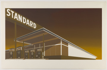Mocha Standard is one of several screenprints identical in composition to Ruscha’s paintings of the station. Unlike the paintings, however, the screenprints are characterized by the lush gradations of color seen in the sky. Here, the chosen palette of chocolate brown and burnt orange sound a soft, even melancholic note that tempers the brash angular forms of the building.