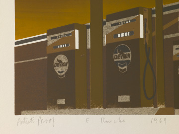 The first gasoline stations to appear in Ed Ruscha’s work were the unremarkable black-and-white snapshots found in his artist’s books. Ruscha soon revealed his flair for casting even the humblest buildings as star attractions. The Standard Oil station became his signature subject, one he repeatedly returned to in both paintings and prints. In both media, the station is glamorized using bold graphic imagery borrowed from the world of commercial design. Dramatic foreshortening and bold diagonals make it appear larger than life, modeled to fita Hollywood “standard.”