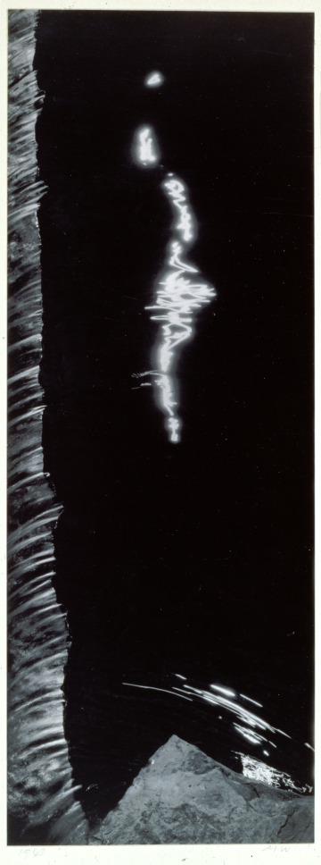 The subject matter is elusive in this image of sunlight reflecting off the surface of a stream. Minor White conveys a sense of elemental purity in his juxtaposition of the brilliant white light and the inky black water. He evokes Japanese calligraphy in the lyrical pattern of the flickering rays of light. White was influenced by the mysticism of Zen Buddhism and strove to use photography as a catalyst for self-awareness and expression.