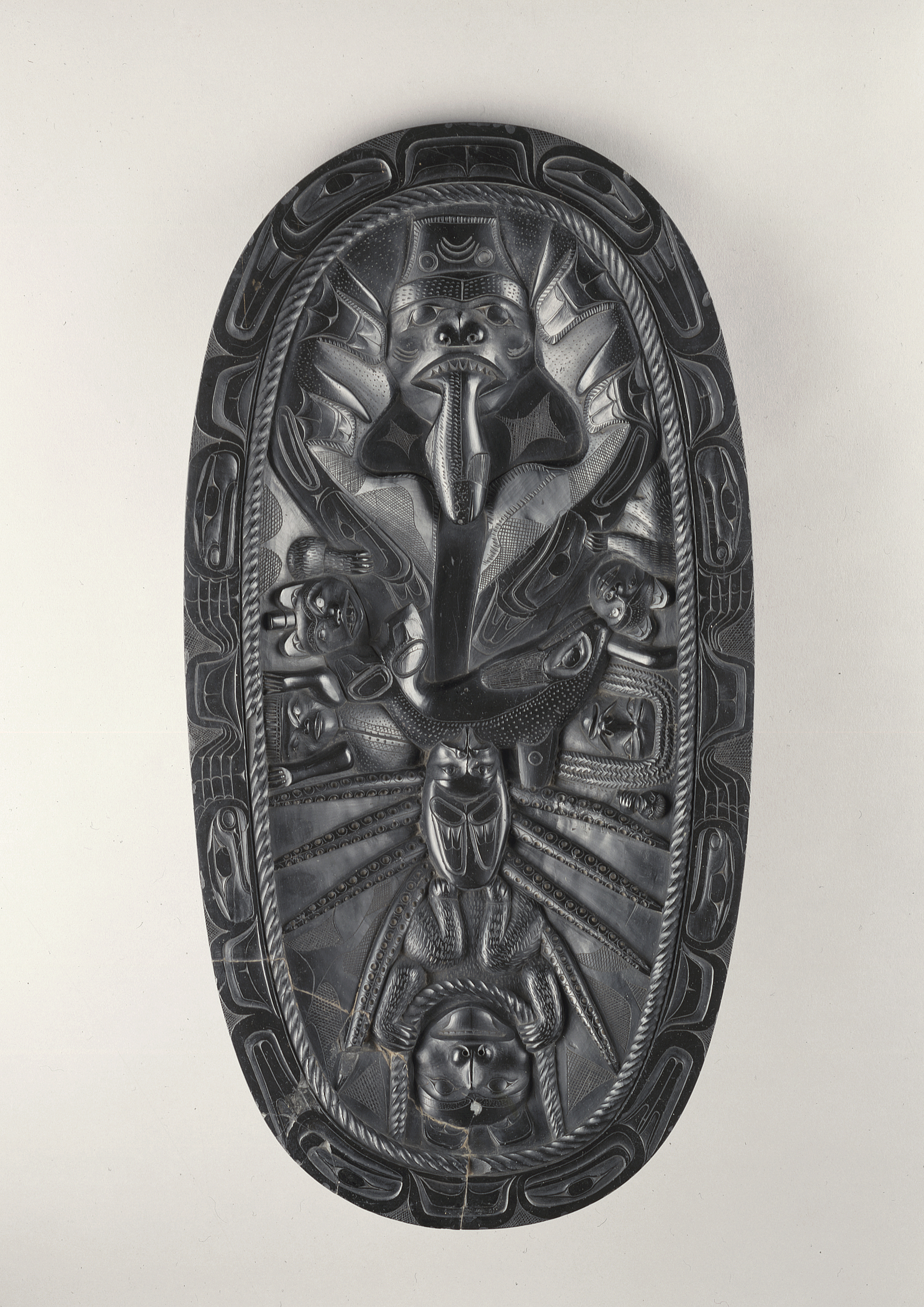 In the 19th century, Haida artists created argillite sculpture for outsiders such as the visiting US Navy officer who originally purchased this platter.