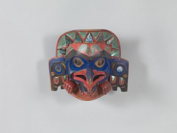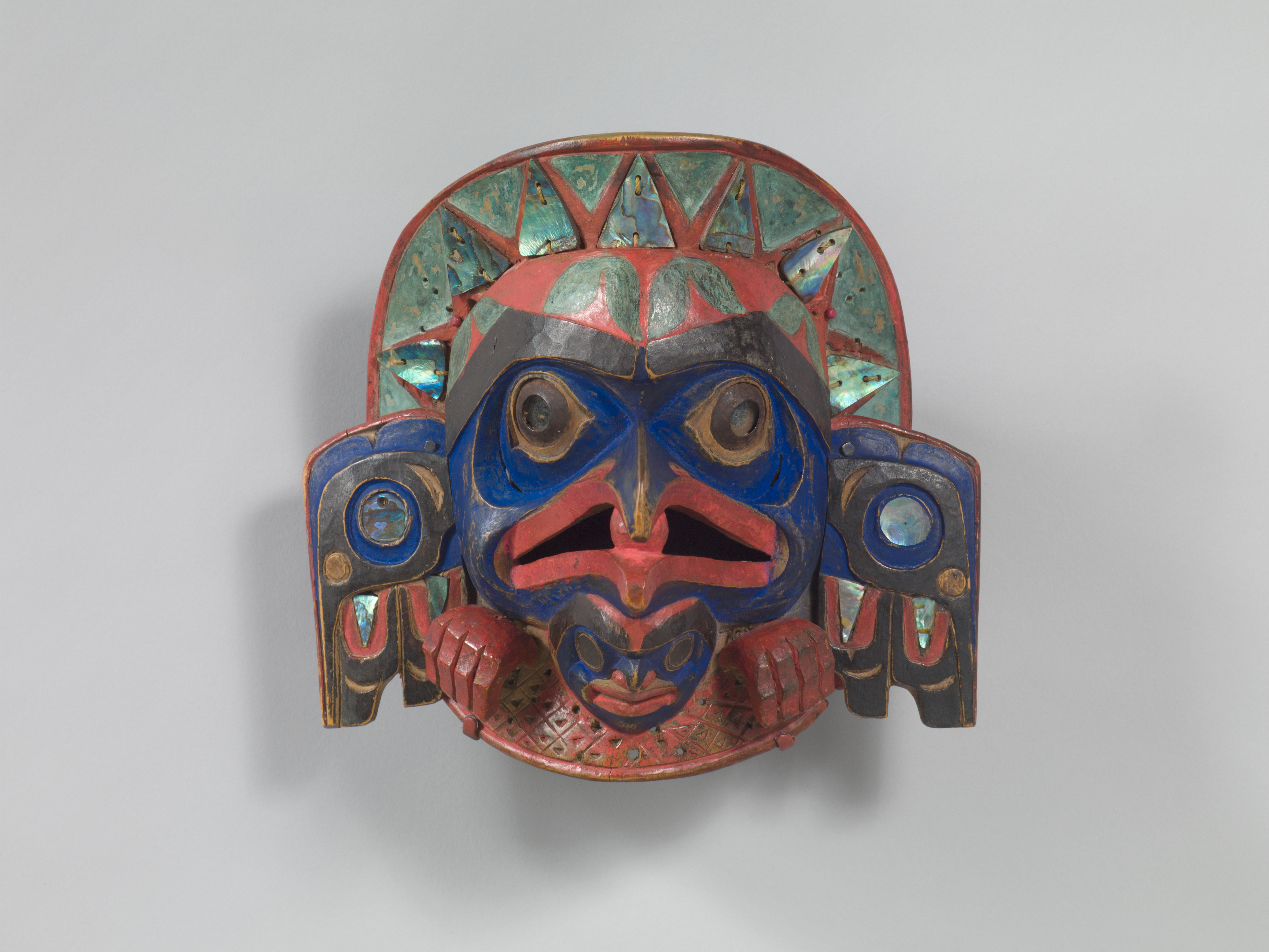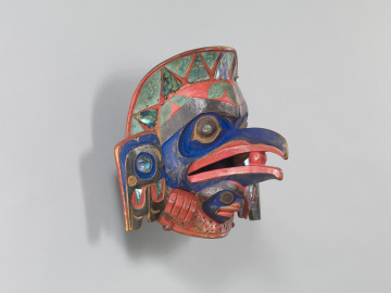 The carving represents a raven. With outstretched wings, the raven grasps a ball—which represents light—in its mouth. This frontlet illustrates the key moment in a Native Northwest Coast story when the trickster bird steals the sun, moon, and stars to illuminate the world. When a dancer wore the frontlet, abalone-shell inlays and mirrored eyes reflected firelight. This effect lent the carving a sense of animism and demonstrated the narrative of raven bringing light.