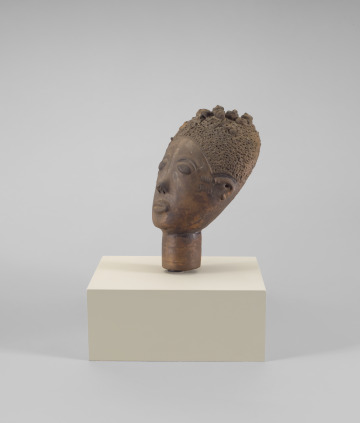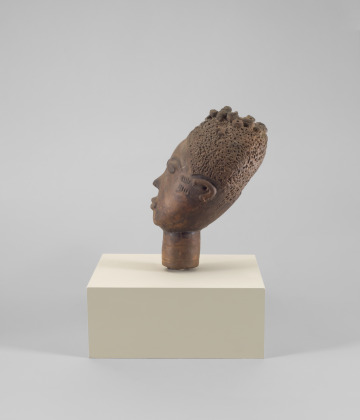The broad forehead and arched eyebrows of this sculpture conveys nobility, while the carefully executed hairstyle signifies high status and courtly demeanor. This head was modeled only after the individual’s death. Consequently, the artist was challenged with the task of reproducing the deceased’s approximate likeness. The Akan made idealized portraits as memorials to important individuals.
