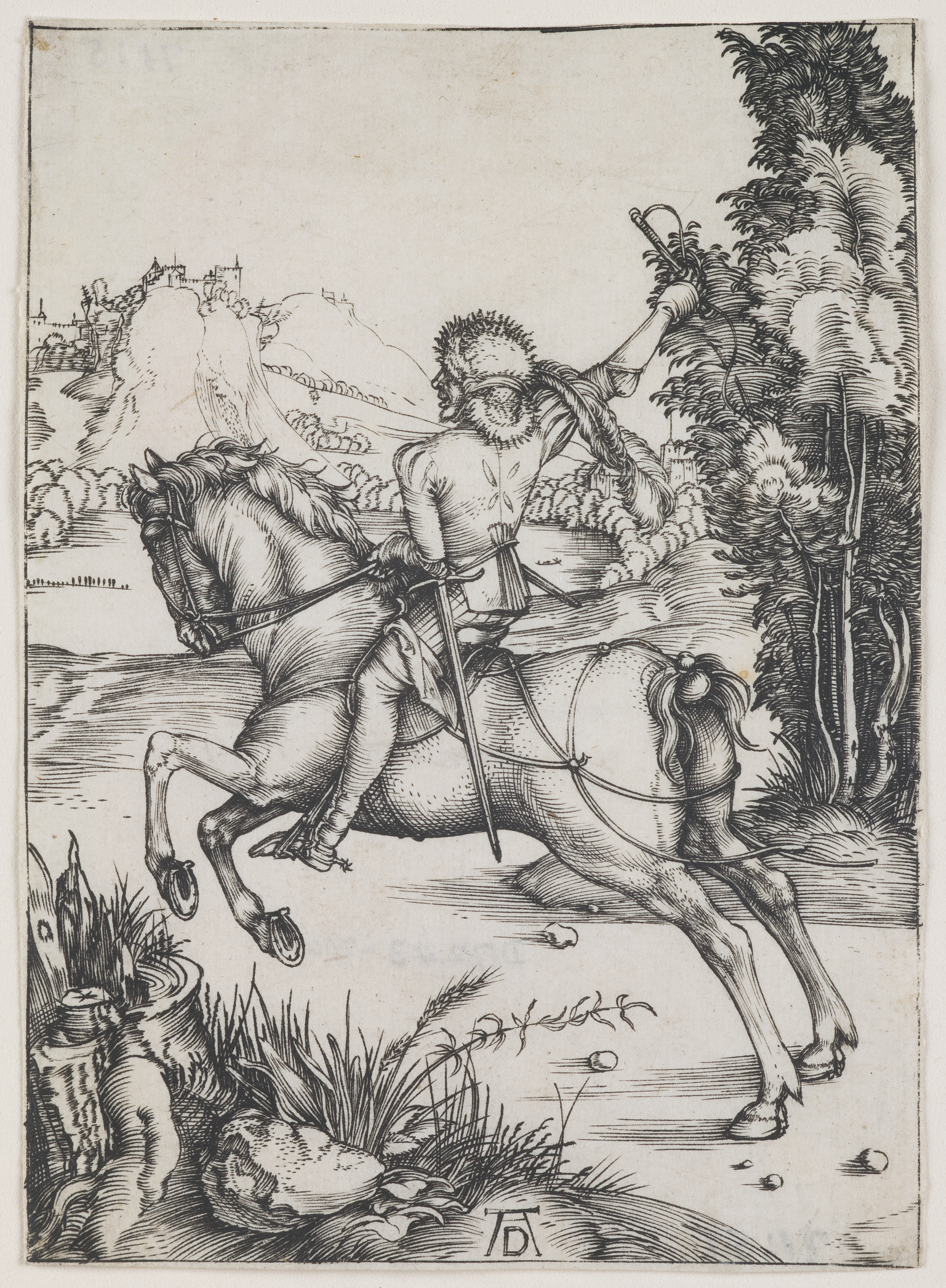 This small but cleanly and confidently engraved horse and rider is one of six similarly-formatted profane subjects engraved by Dürer in 1496–97. Writers disagree about whether this figure is a “courier” or perhaps a military figure, but they unfailingly describe his gesture as energetic. The young artist’s focus on subjects from life as opposed to history or literature would seem to suggest a pointed approach to the market, although he only rarely afterwards depicted such secular subjects.