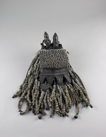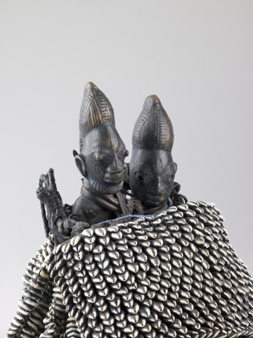 These figures, one male and one female, suggest the Yoruba god Eshu’s ability to bring opposites and complementary entities together. Eshu is known as the messenger between this world and the spiritual realm of the orishas and ancestors. The figure pair also emphasizes the duality inherent in Eshu’s personality. Known as a trickster, Eshu represents unpredictability and uncertainty in the universe. When this object was not set up as a shrine dedicated to the god, a devotee danced with it, activating its dangling bells and shells, at Eshu festivals held in the marketplace. Eshu is also considered the guardian of the markets and crossroads.