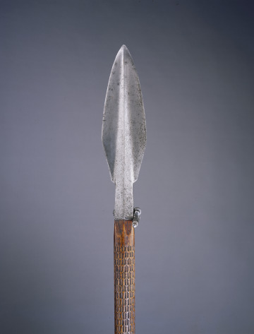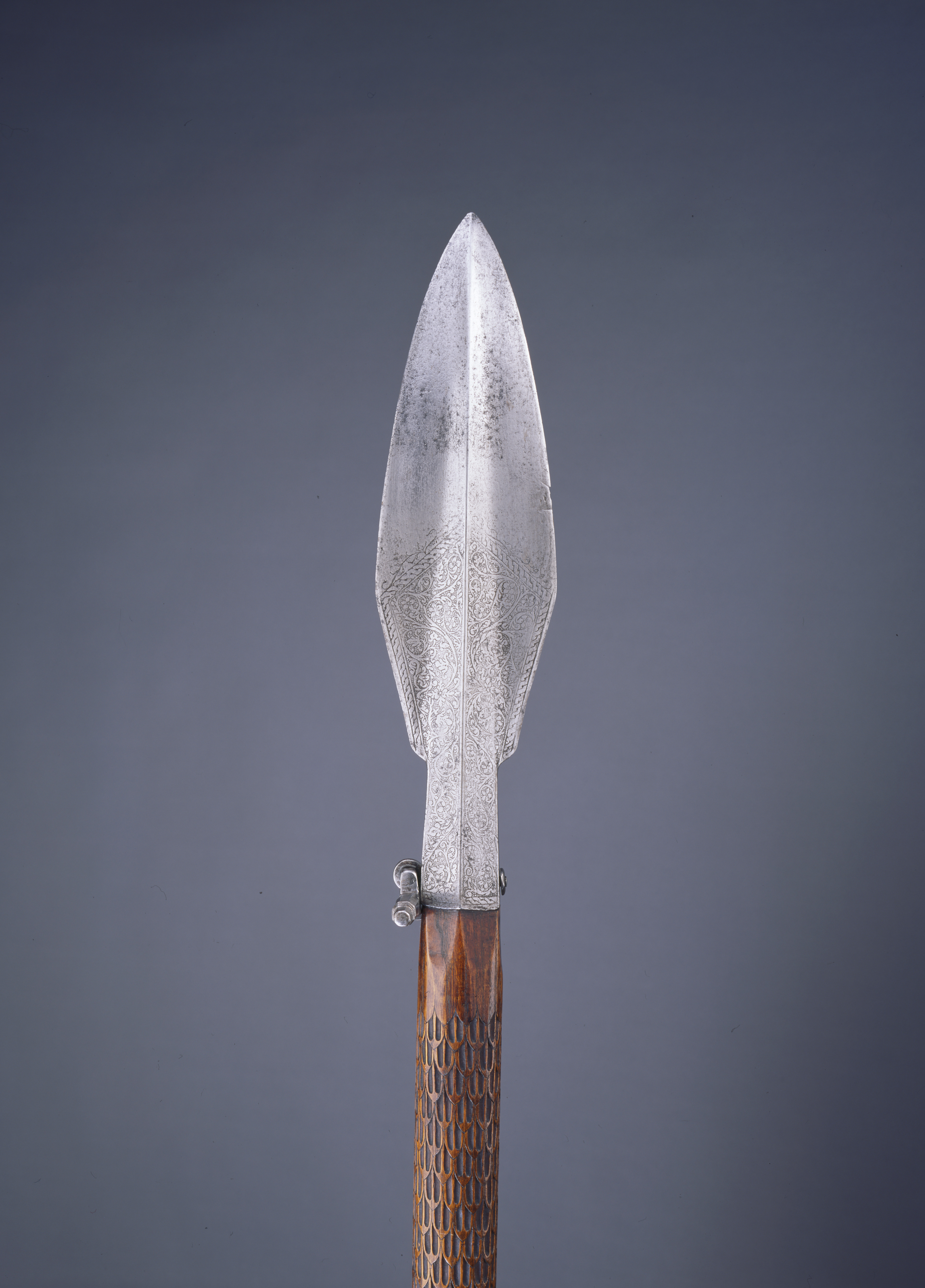 Etched vines decorate the blade of this spear for hunting large game like boars or bears. The overlapping leaves carved on the shaft also made for a firmer grip. The crossbar mounted behind the blade prevented the spear from penetrating too deeply, which protected the hunter from a wounded boar’s slashing tusks. Hunting was a popular sport among European nobility. Such events were often spectacles of pageantry, in which weapons were ornamented like works of art.