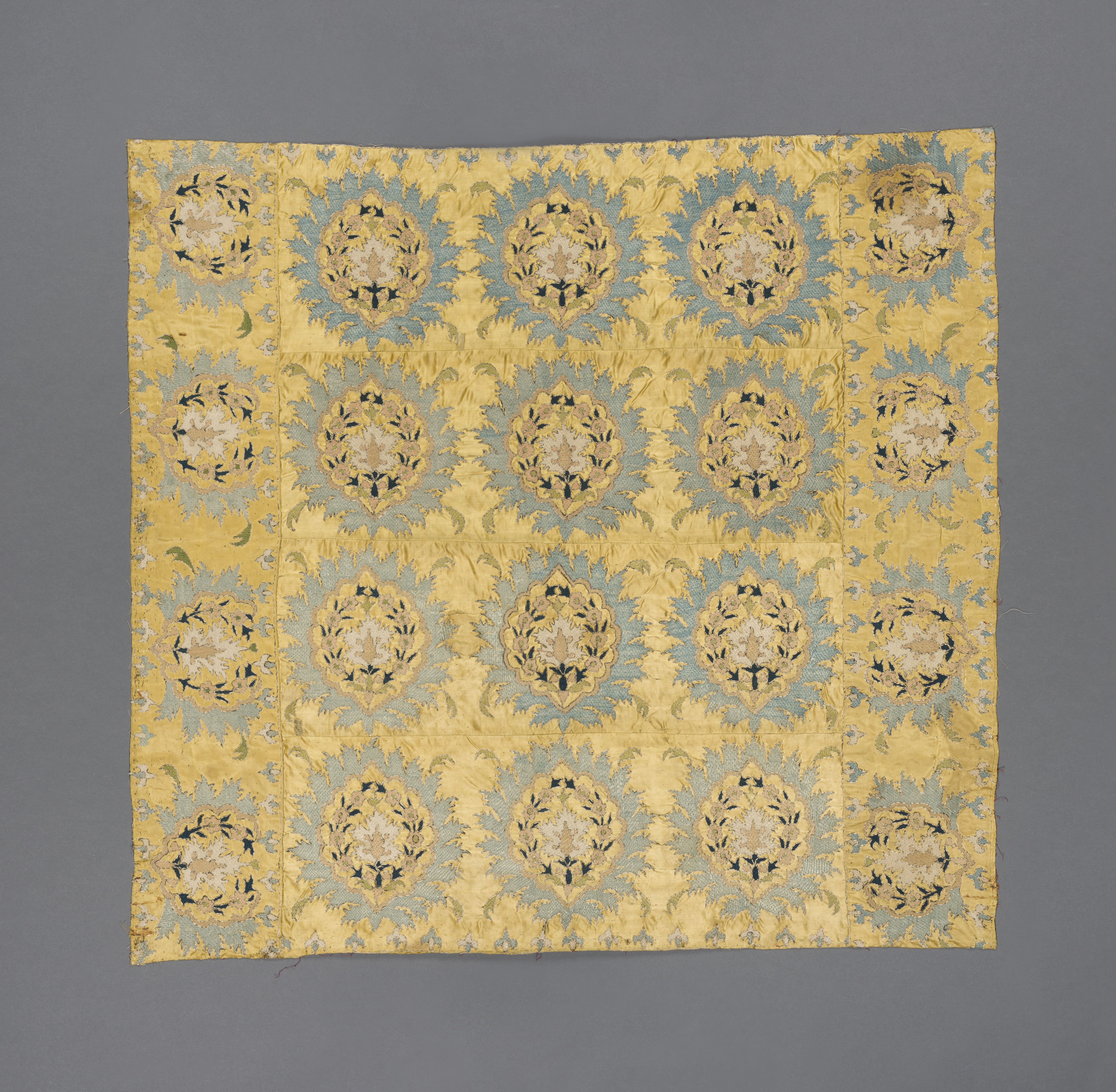 The design on this pieced textile imitates the pomegranate or artichoke patterns of Turkish woven silks. In the main field are twelve units in four horizontal rows, framed at top and bottom by a narrow edging of palmettes. On the left and right is a vertical row of four units set sideways and edged on the long sides with a palmette design. The numerous colors include yellow, green, pale blue, buff, cream, and deep blue-green. There are some areas where the tarnished silver threads are visible, but many of them are gone due to use.