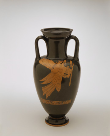 The spotlight technique—the use of a single figure featured on either side of a vessel—takes advantage of the round form of this amphora. The viewer must look at both sides to understand the full story. Here, the goddess Nike, or Victory, flies through the air presenting a musical instrument called a cithara (a type of fancy, large concert lyre) to present to the young man standing on the other side. Taken together we can interpret this scene as a celebration of the youth’s victory at a musical competition. The spotlight technique was favored by this artist, called the Berlin Painter after the city in which his style was first identified. The Berlin Painter represents a high point of ancient painting due to the precise draftsmanship and fine attention to detail especially, in the ears and eyelashes.