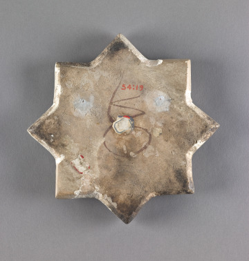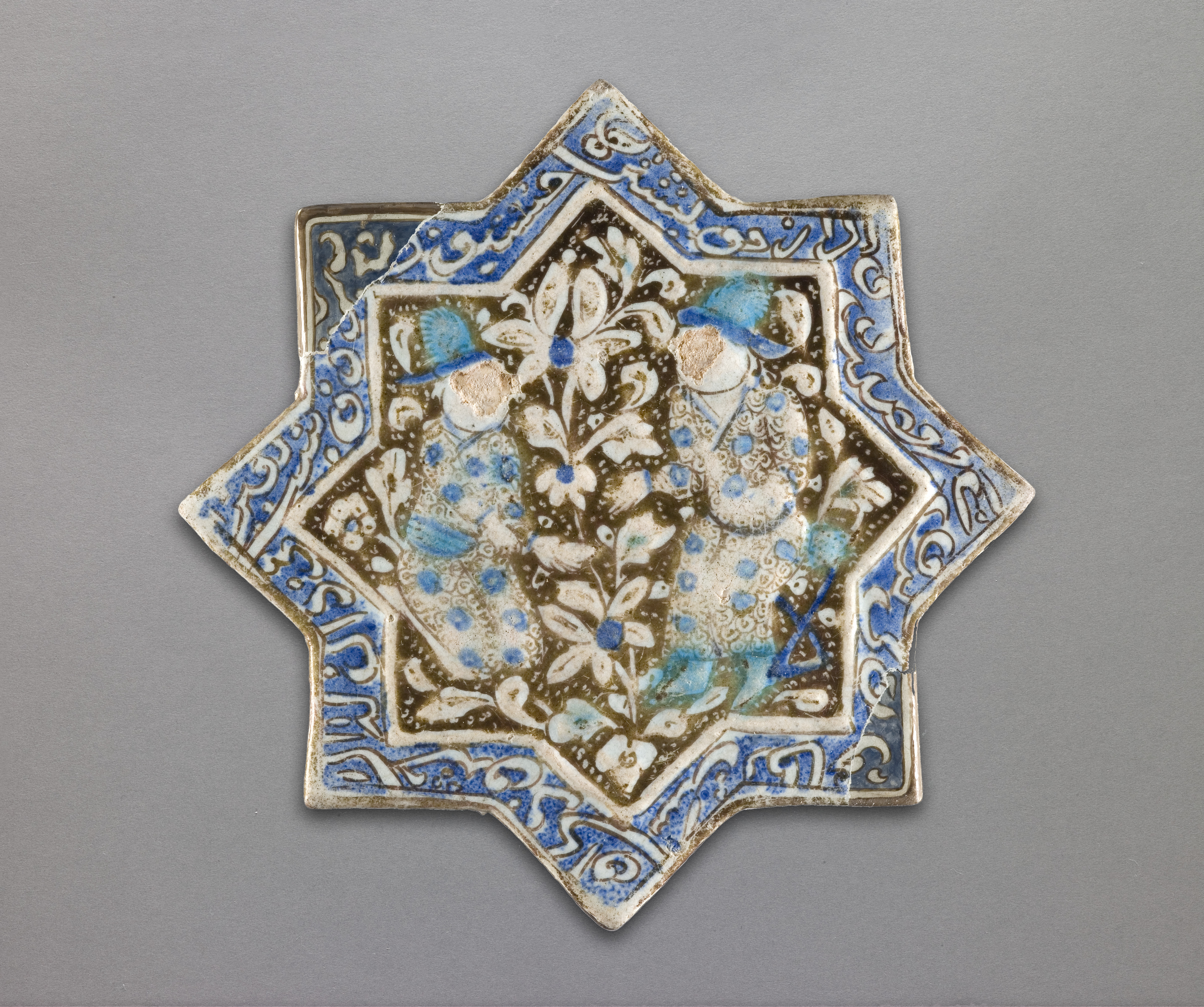 Ilkhanid, or Mongol-era luster tile panels were delightfully eclectic. Tiles with figural and non-figural decoration were often combined in a single panel. The star-shaped tiles were connected by cross-shaped tiles in between, which may or may not have had a similar luster glaze. Inscriptions usually consisted of Persian poetry or Qur’anic verses, which could be placed side-by-side, and rarely seem to bear any thematic relation to the central decoration.