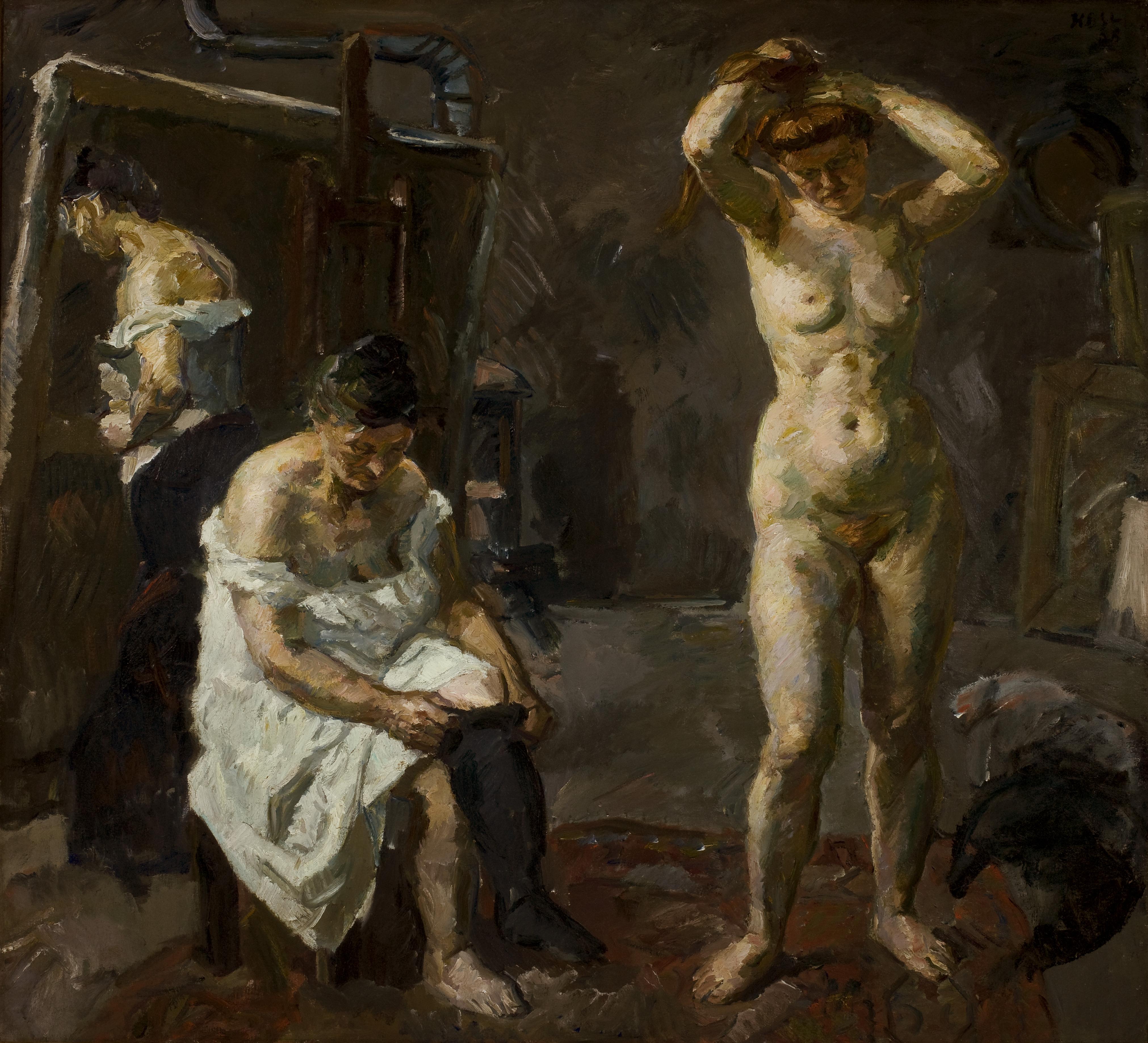 Beckmann’s fascination with the human form was underpinned by close study of nude models. Here, three women pose in the upper floor studio of the artist’s house near Berlin. Each is in a different state of undress with the most prominent figure completely nude and pulling her red hair behind her head. As with many of Beckmann’s early works, the painting is inscribed HBSL at upper right, an abbreviation for "Herr Beckmann Seiner Liebsten" (Mister Beckmann to his love), a dedication to his first wife, Minna.