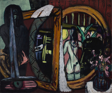 While best known as a painter and printmaker, Beckmann took up sculpture in the mid-1930s and often incorporated sculptural elements into his later paintings. The dark, masculine head, seen in the oval mirror yet not in front of it, is similar to a bust he made of himself a decade before.