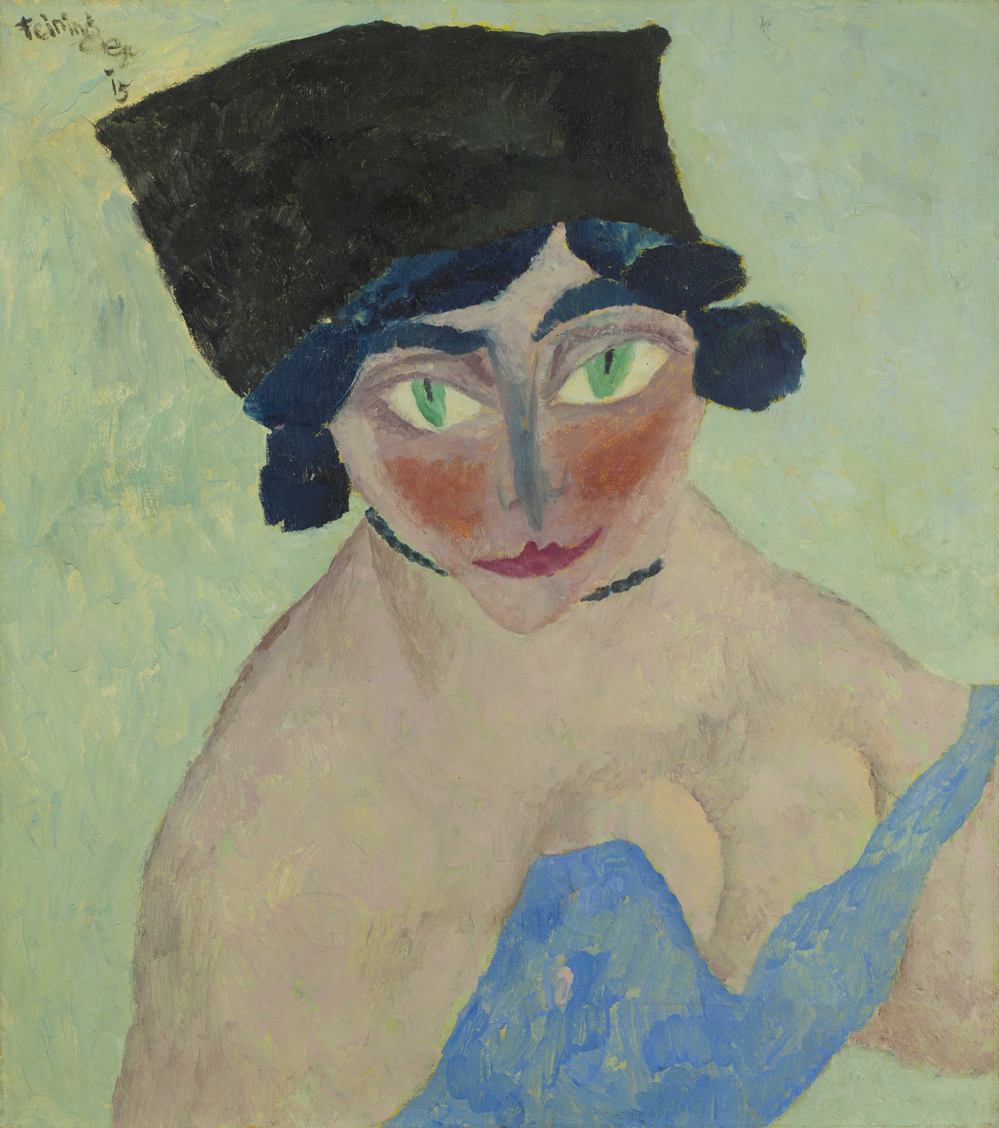 The woman looking out of this painting is Julia Feininger, the artist’s wife. She was a trained artist who supported her husband’s dream to leave his job as an illustrator to become a full-time painter. During their almost 50 years of marriage, Lyonel Feininger made hundreds of sketches and photographs of Julia, in which she often wore elaborate hats like this black toque. This portrait remained in the family’s possession until after her death in 1970.
